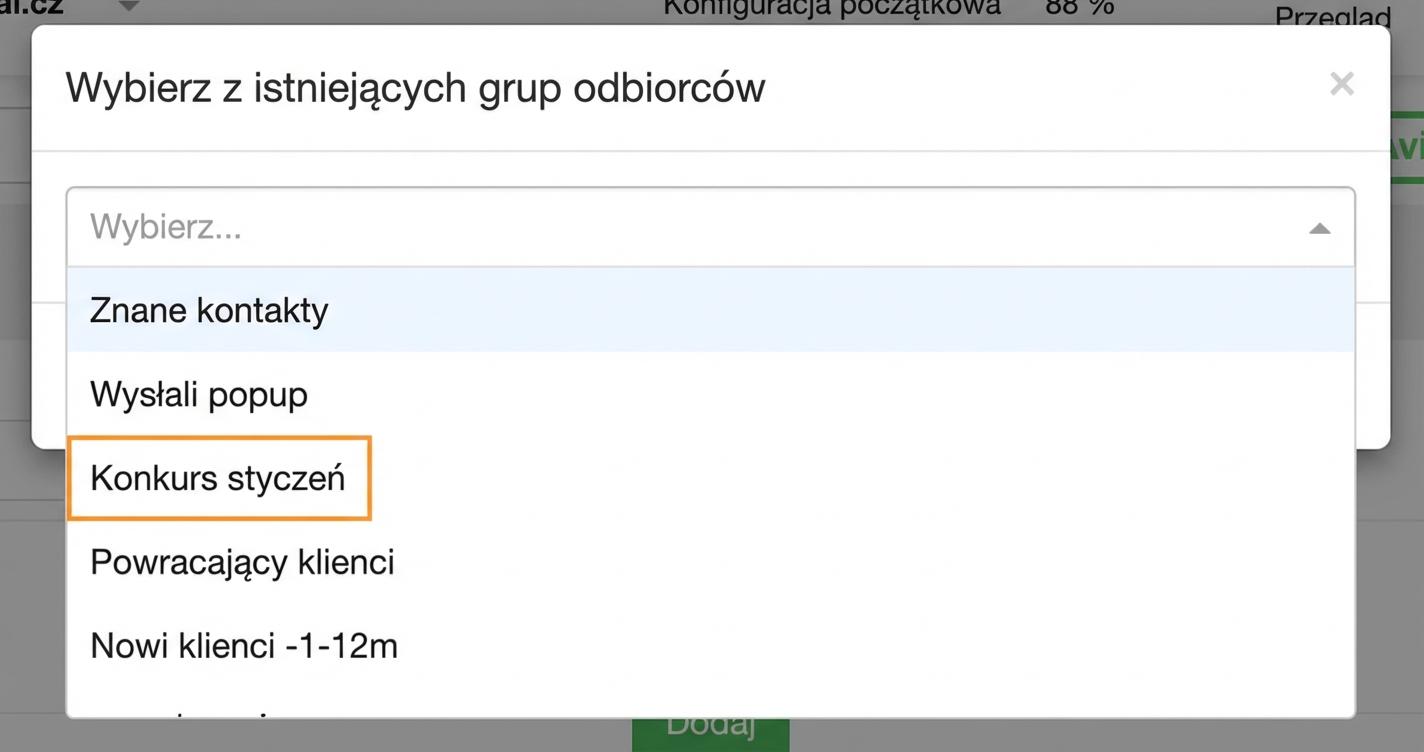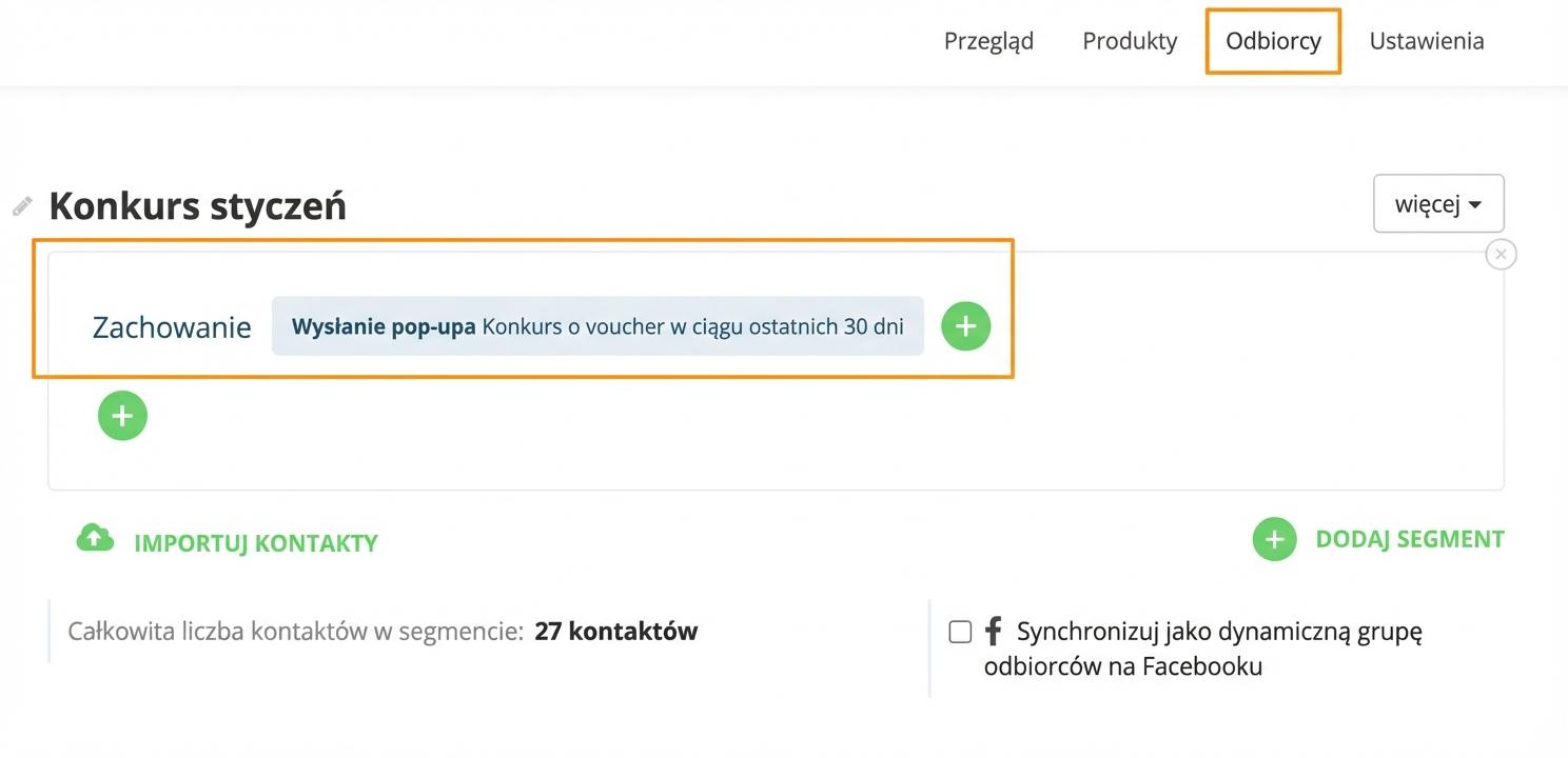 Zainteresowanych, którzy zarejestrowali się do konkursu, sprawdzisz bardzo łatwo. W zakładce Audience dodasz regułę „Zachowanie – wysłali pop-up + jego nazwa mniej niż XY godzin temu”. Z listy uczestników następnie losowo wybierz zwycięzcę lub zapisz grupę odbiorców, wyeksportuj i do losowania możesz użyć aplikacji firmy trzeciej.