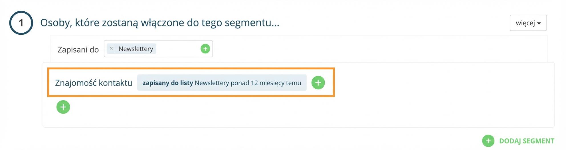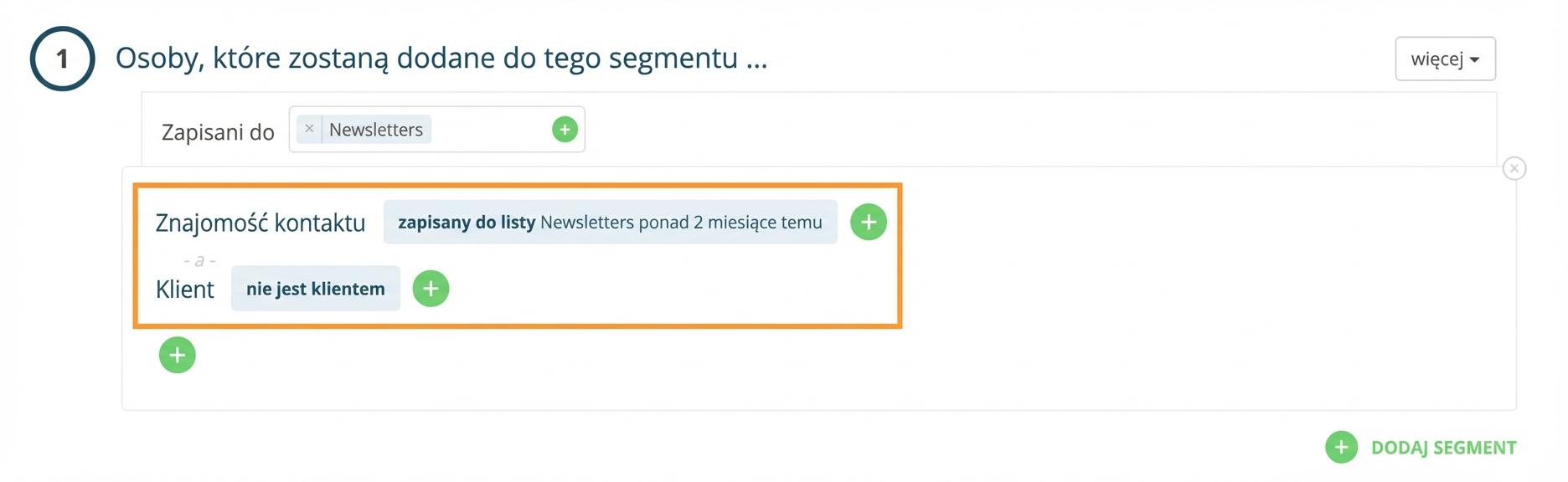 Zawsze trzeba uważać, aby jednorazowa wysyłka została wysłana wyłącznie do odpowiedniej grupy odbiorców. Osiągniesz to, ograniczając warunek z drugiej strony — zob. przykład powyżej. Gdybyś bowiem nie dodał warunku „ostatni zakup mniej niż 10 miesięcy temu”, e-mail zostałby wysłany także do klientów, którzy kupili np. ponad 1 rok temu, 2 lata temu itd. Jeśli chcesz dotrzeć wyłącznie do aktywnej części bazy, należy ograniczyć warunek zgodnie z poprzednim przykładem.
