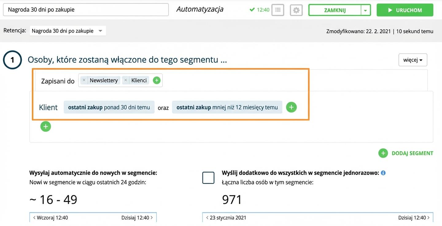 Wystarczy ustawić proste reguły Segmentacja w kampanii automatycznej. Dzięki temu e-mail zawsze zostanie wysłany w odpowiednim momencie do właściwego segmentu odbiorców.