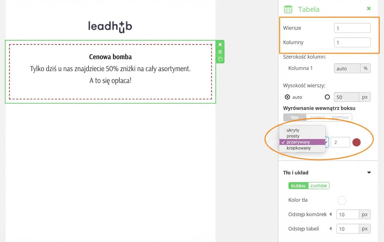 3. Wybierz obramowanie – kolor, typ i szerokość. Możesz także zmienić tło tabeli lub odstępy w komórkach (tekstu w komórce) oraz całej tabeli.