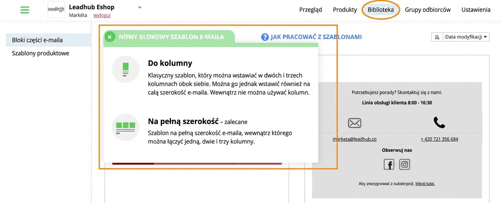 1. W zakładce "Biblioteka" kliknij opcję "Nowy blokowy szablon e-maila" i wybierz jedną z opcji (do kolumny lub na całą szerokość – zalecane):