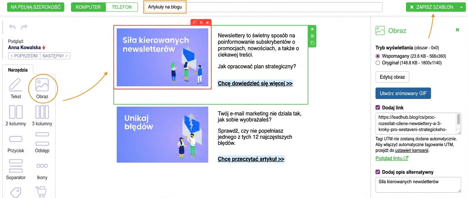 2. Zostaniesz automatycznie przekierowany do edytora, gdzie utworzysz nowy szablon poprzez przeciąganie poszczególnych bloków myszą do treści e-maila. Nazwij szablon i zapisz.