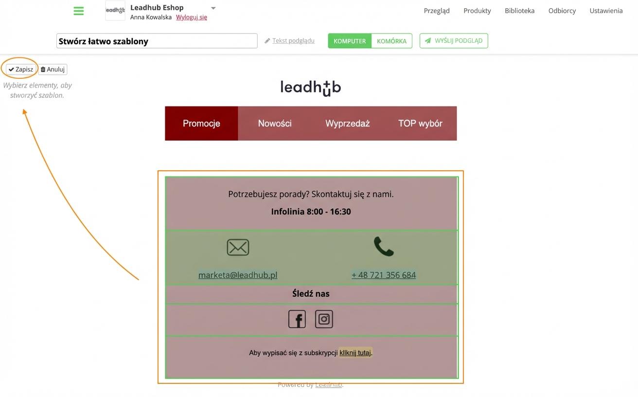 Szablon utworzony bezpośrednio w edytorze e-maili automatycznie wyświetli się także w "Bibliotece".