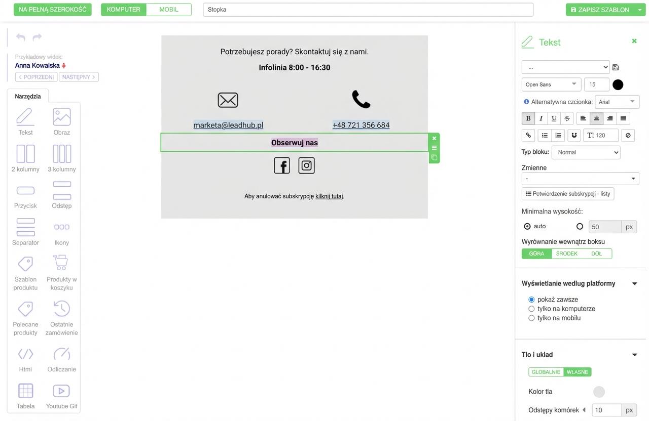 Szablon utworzysz także bezpośrednio w edytorze e-maili, zaznaczając poszczególne bloki, które zgrupujesz w jedną całość (szablon).