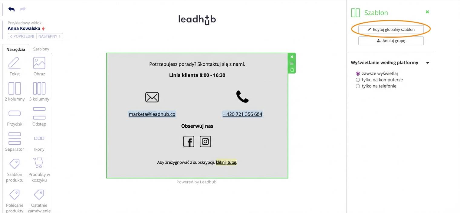 2. Bezpośrednio w edytorze po przeciągnięciu szablonu do treści e-maila i kliknięciu opcji "Edytuj globalny szablon".