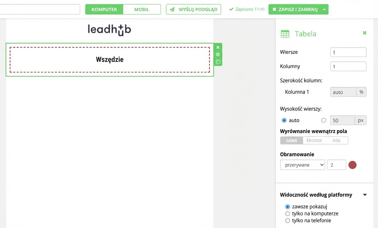 Przeciągnij wybrany obiekt myszą do treści e-maila. W panelu edycji po prawej stronie, w zakładce "Wyświetlanie według platformy", wybierz z opcji, gdzie dany obiekt ma się wyświetlać.