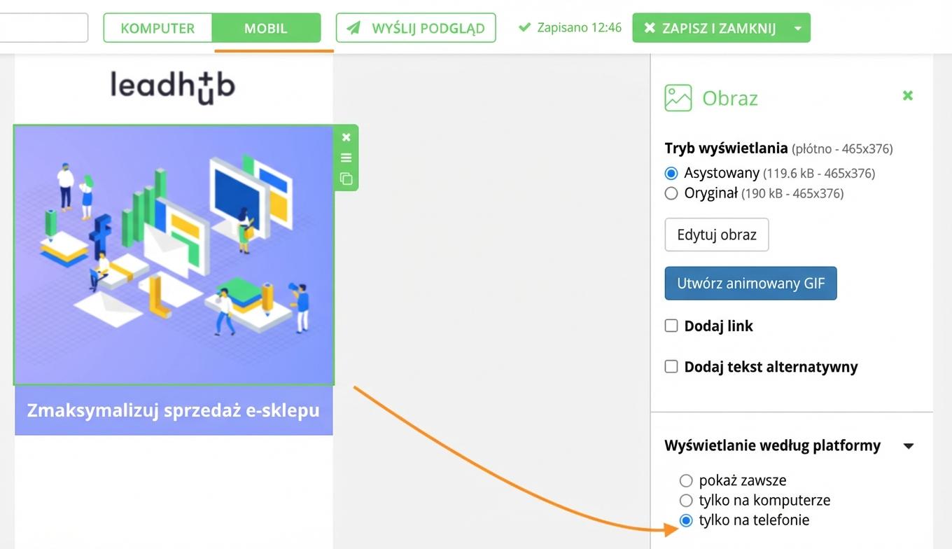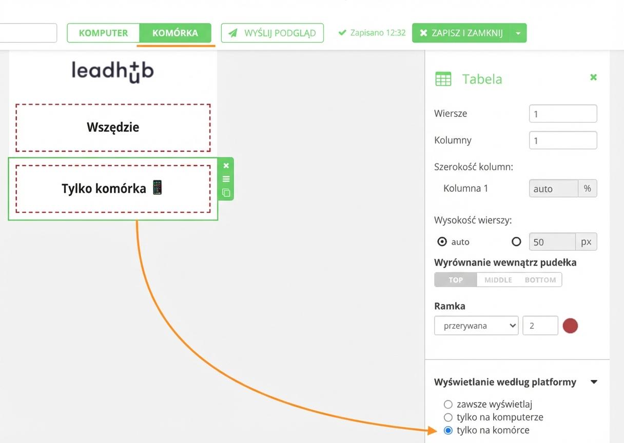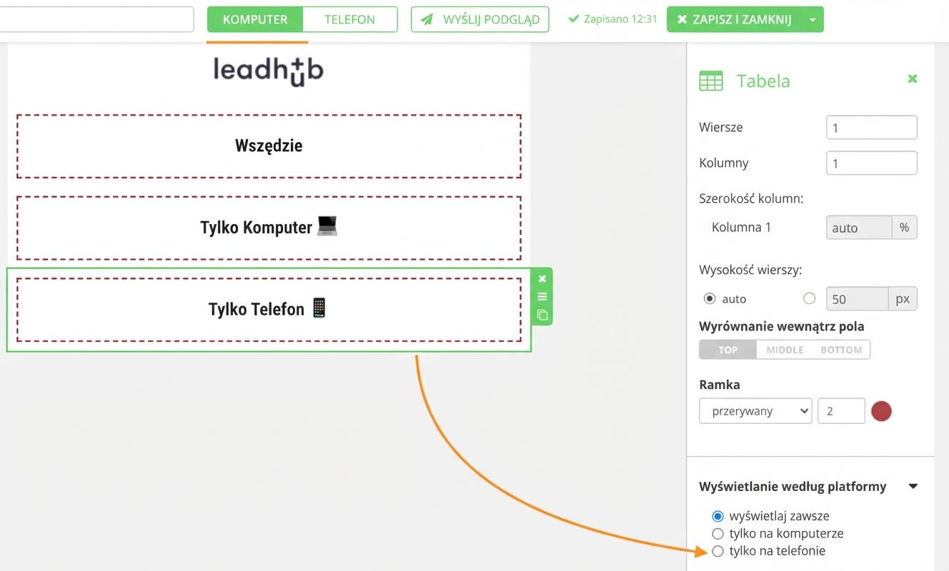 W edytorze e-maili można ustawić, które elementy będą wyświetlane tylko na desktopie lub odwrotnie – tylko na telefonie komórkowym.