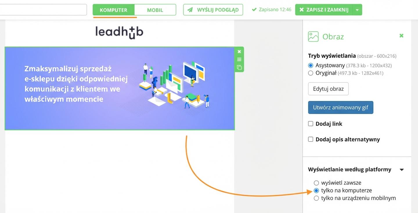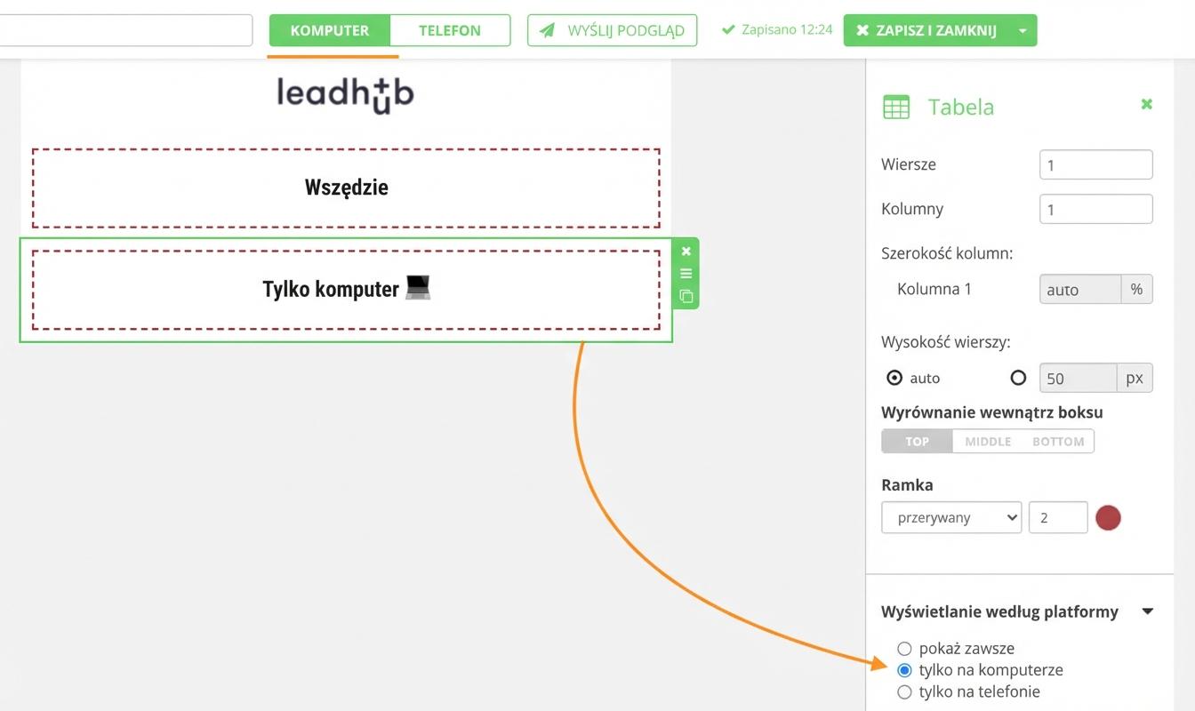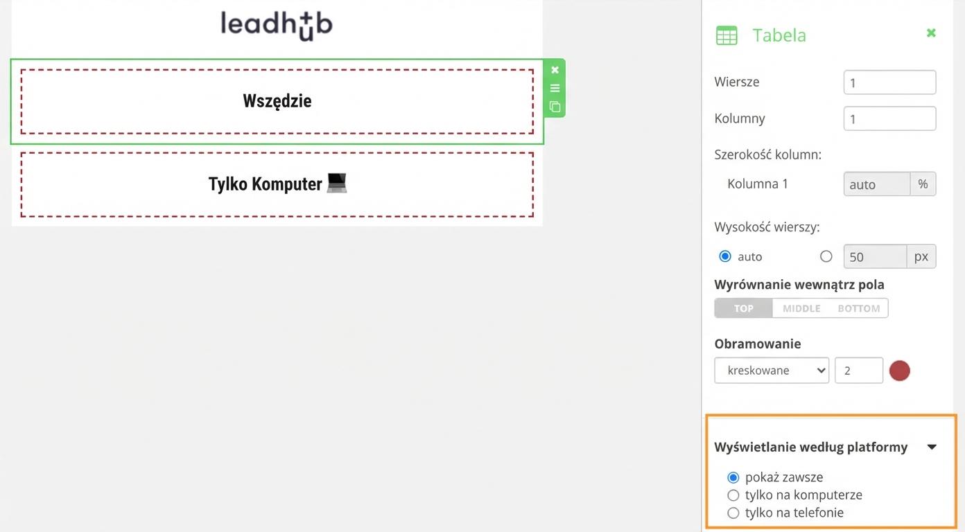 W edytorze e-maili można ustawić, które elementy będą wyświetlane tylko na desktopie lub odwrotnie – tylko na telefonie komórkowym.