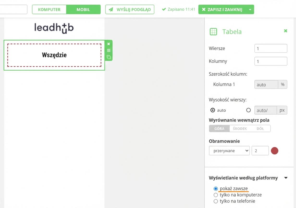 Jeśli wybrana jest ta opcja, obiekt będzie wyświetlany zarówno na telefonie komórkowym, jak i na desktopie. Sprawdzisz to, przełączając się między Komputerem a Telefonem komórkowym w górnej części edytora. Ten obiekt automatycznie dopasuje się do rozmiaru urządzenia mobilnego (tzn. jest responsywny).