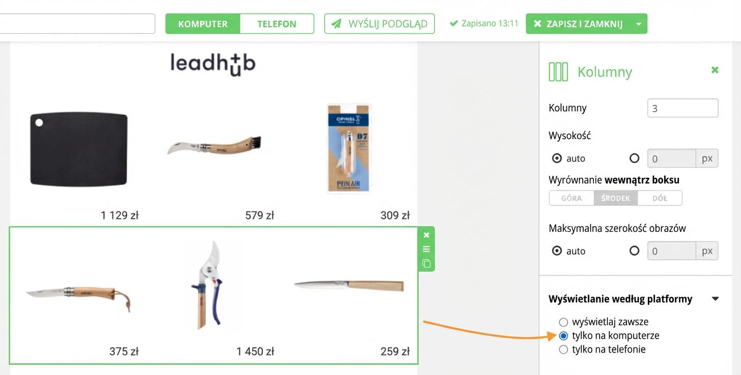 → Dla dolnego bloku z 3 Polecane produkty włączymy opcję wyświetlania "tylko na komputerze".