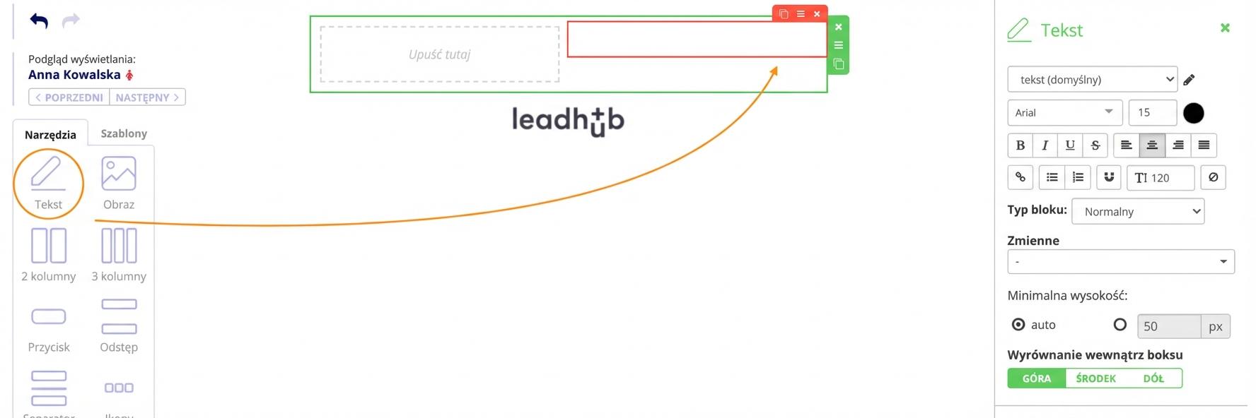 1. Wstaw do treści e-maila obiekt „tekst”.