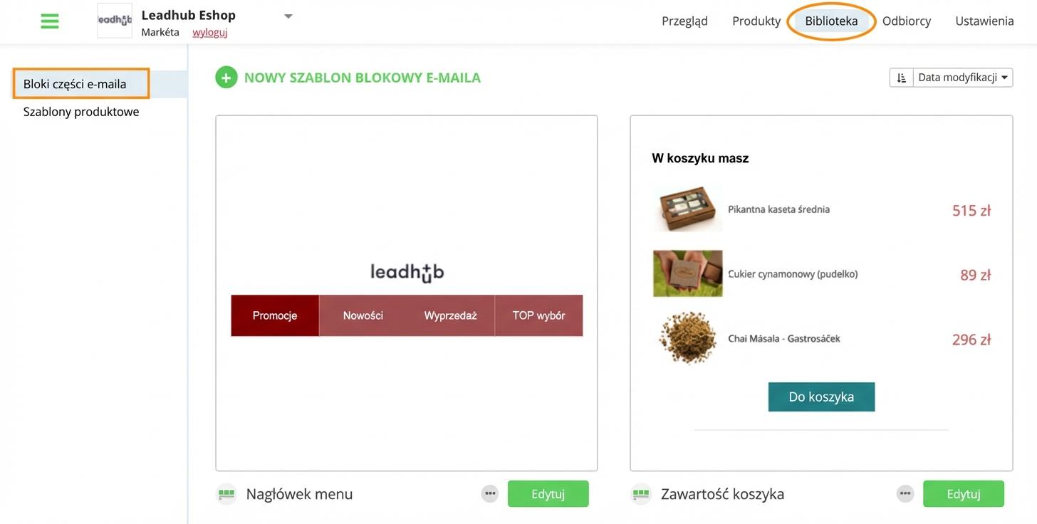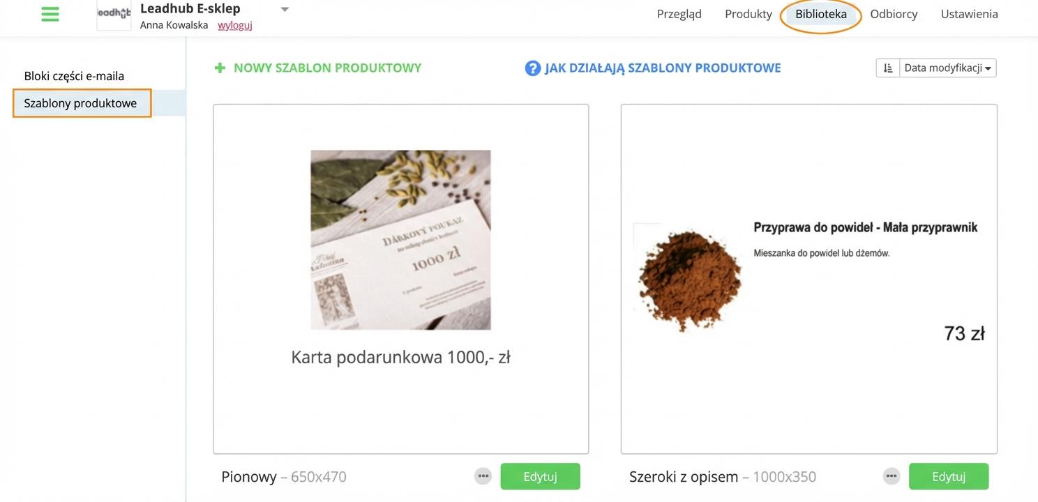 W zakładce "Biblioteka" znajdziesz zarówno szablony bloków e-maili, jak i szablony produktowe. Wszystkie gotowe oraz nowo utworzone przez Ciebie szablony będziesz mieć przejrzyście w jednym miejscu.