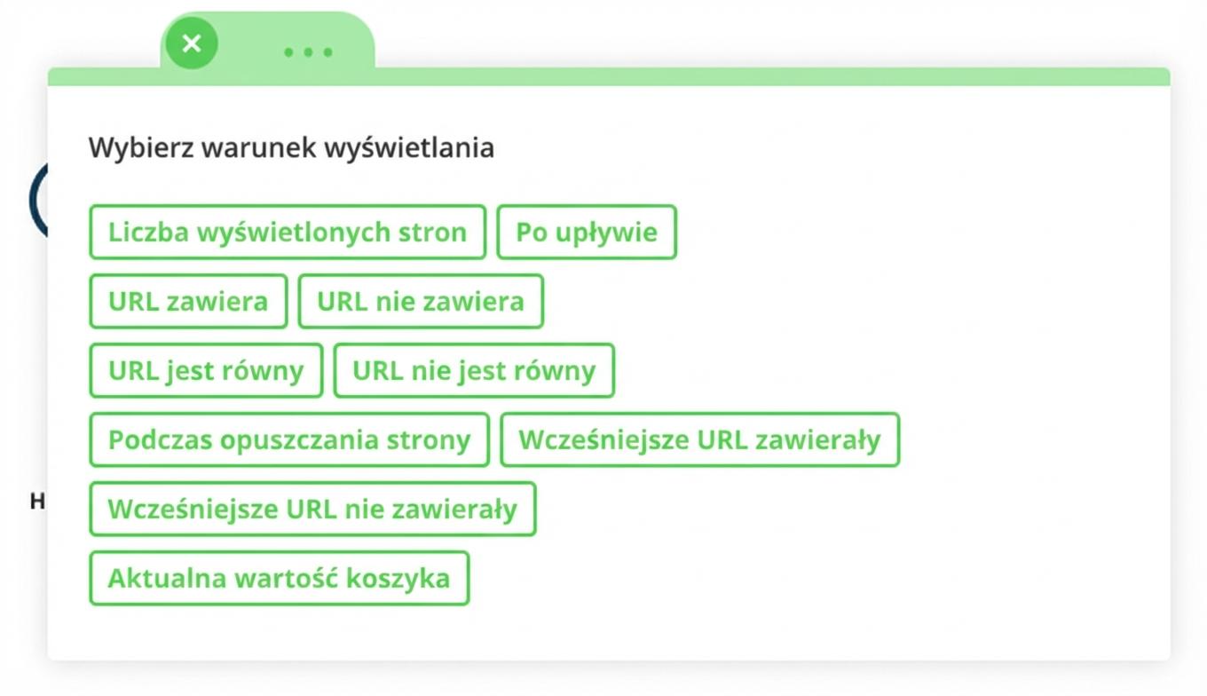 Okna pop-up możesz targetować na różne sposoby. Zarówno na podstawie wiedzy o odwiedzających Twoją stronę, jak i według innych warunków, kiedy mają się wyświetlić – po upływie określonego czasu, według liczby wyświetlonych stron, na konkretnych adresach URL i wielu innych. Jedną z możliwości jest także określenie wyświetlania okna pop-up na podstawie aktualnej wartości koszyka.