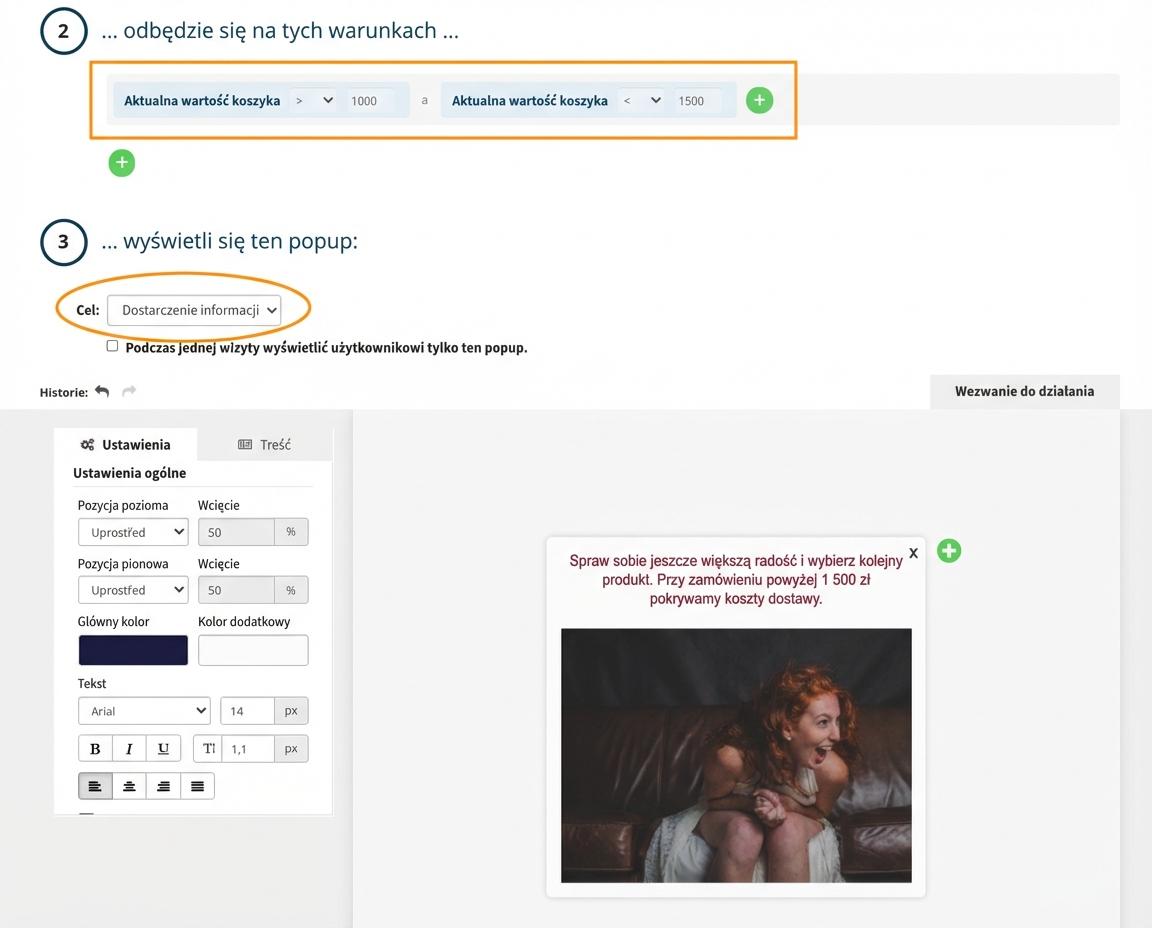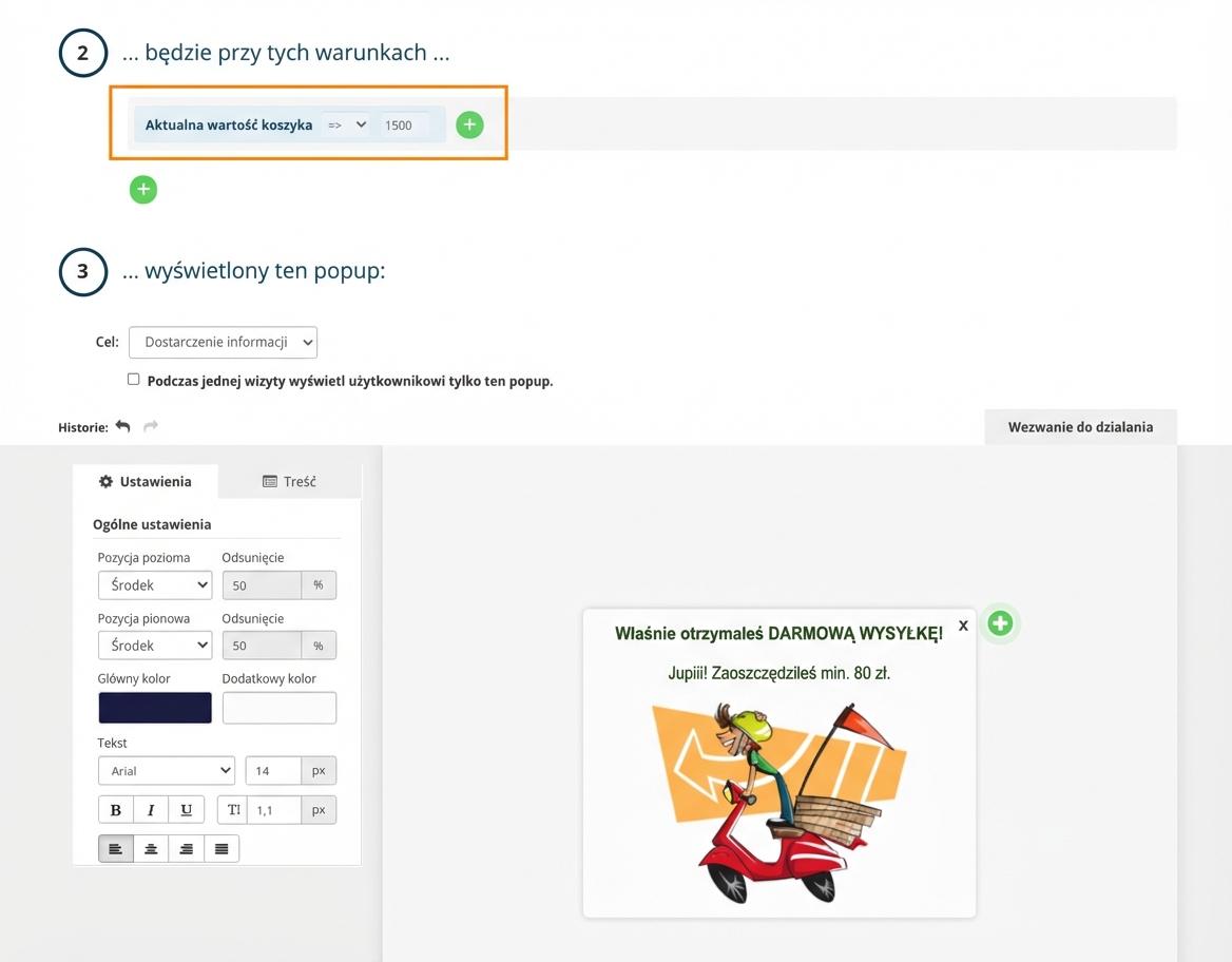 Na podstawie tego, jaka jest aktualna cena koszyka, możesz wyświetlać pop-upy. W ustawieniach pop-upu w drugim kroku wystarczy tylko użyć reguły "Aktualna wartość koszyka".