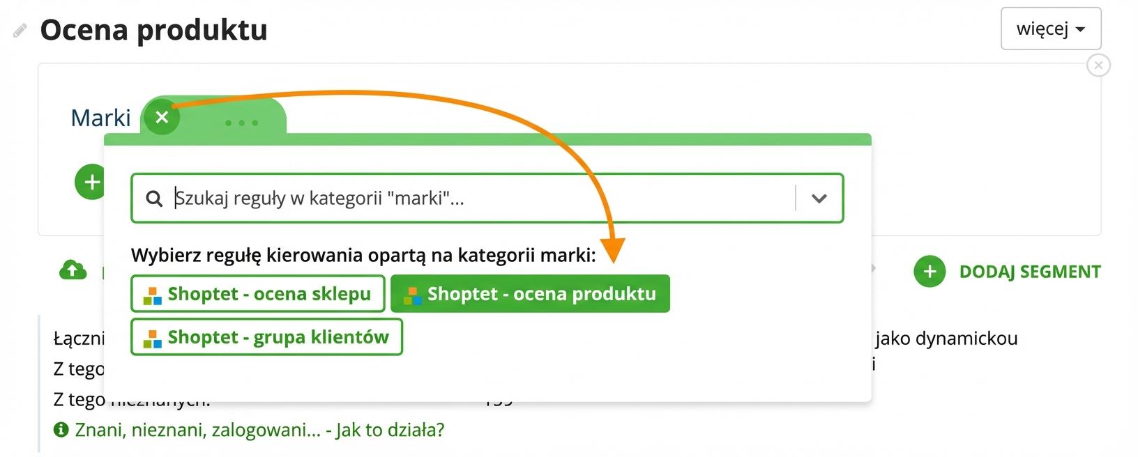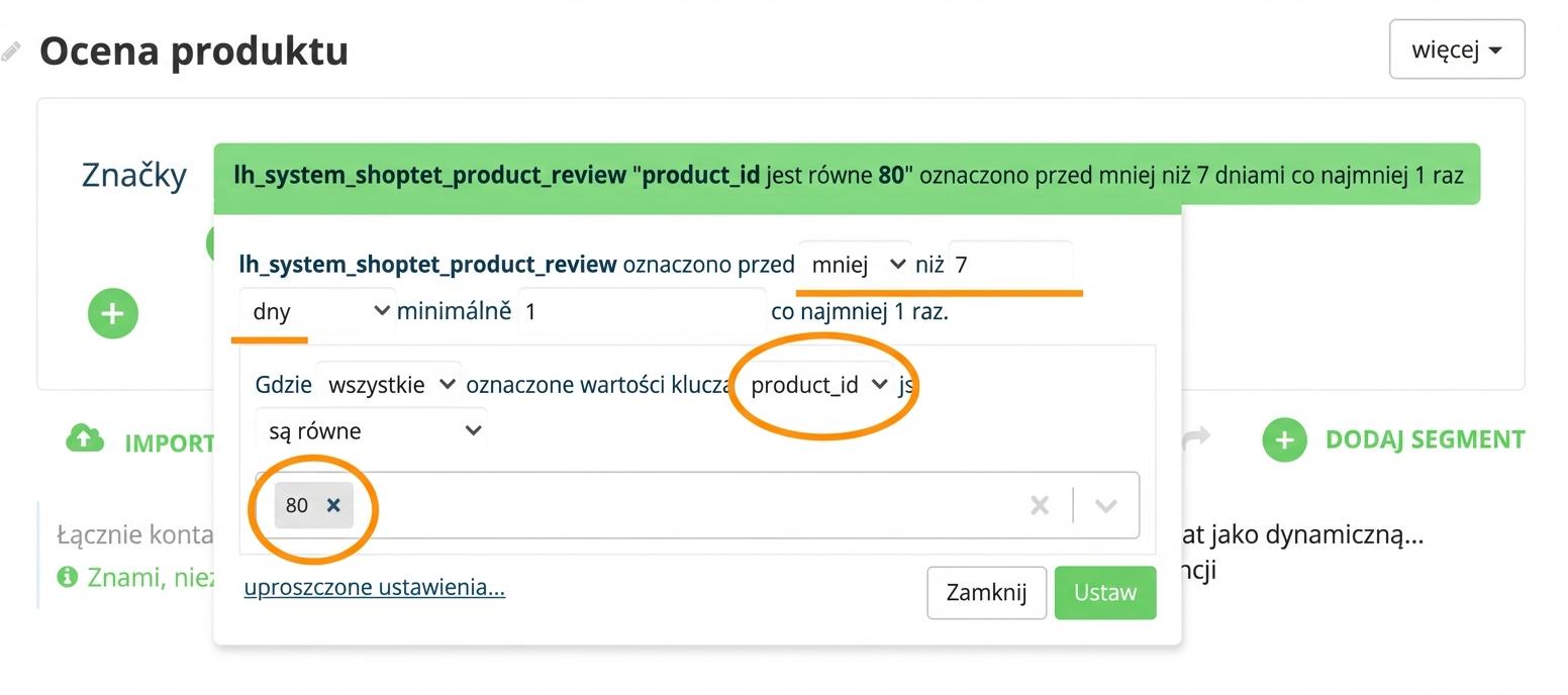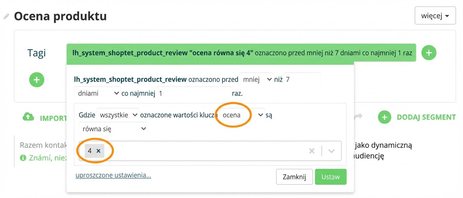 W bardziej zaawansowanych ustawieniach możesz doprecyzować konkretne produkty, które zostały ocenione, lub wybrać parametry według liczby przyznanych gwiazdek, a także uzupełnić przedziały czasowe, kiedy etykieta została dodana.