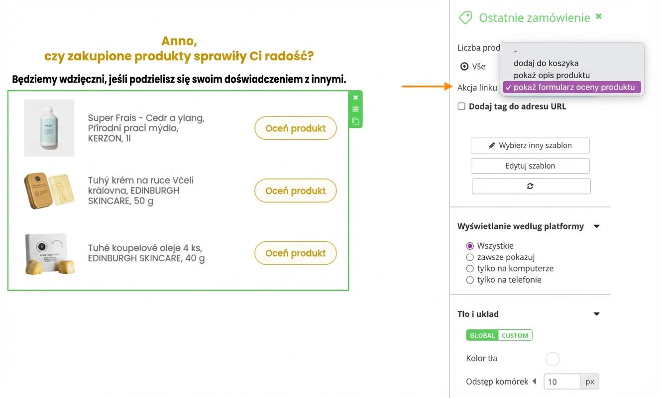 Zachęć klientów do oceniania produktów automatycznym e-mailem. Zmotywuje on klienta, a jednocześnie ułatwi mu drogę do wystawienia oceny produktów. E-mail może bowiem zawierać produkty z jego ostatniego zamówienia oraz skonfigurowane automatyczne przekierowanie z e-maila bezpośrednio do sekcji "ocena produktu" na Twojej stronie.