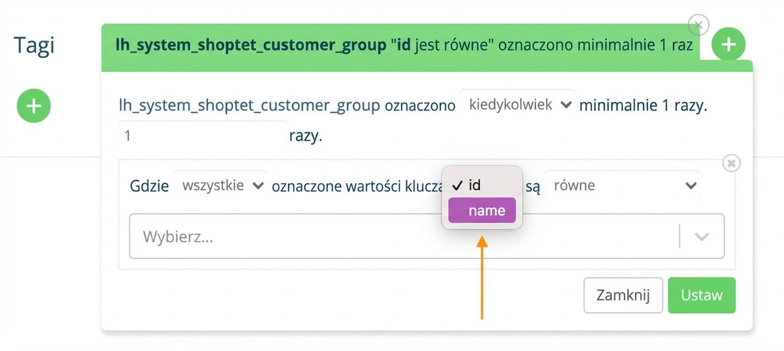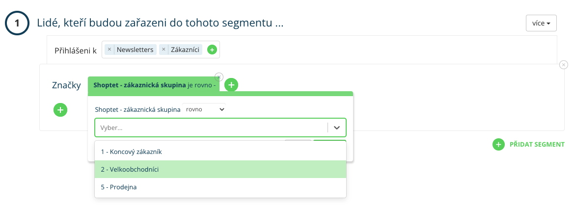 2. name - segmentacja na podstawie nazwy grupy klientów — w wyborze pozostają również grupy po zmianie nazwy (jeśli grupę „velkobchodnici” zmienisz na „velkobchodníci”, w wyborze pozostaną obie). Trzeba więc uważać, która grupa jest aktualna, albo użyć segmentacji według etykiety „Shoptet - grupa klientów”, którą opisujemy powyżej.