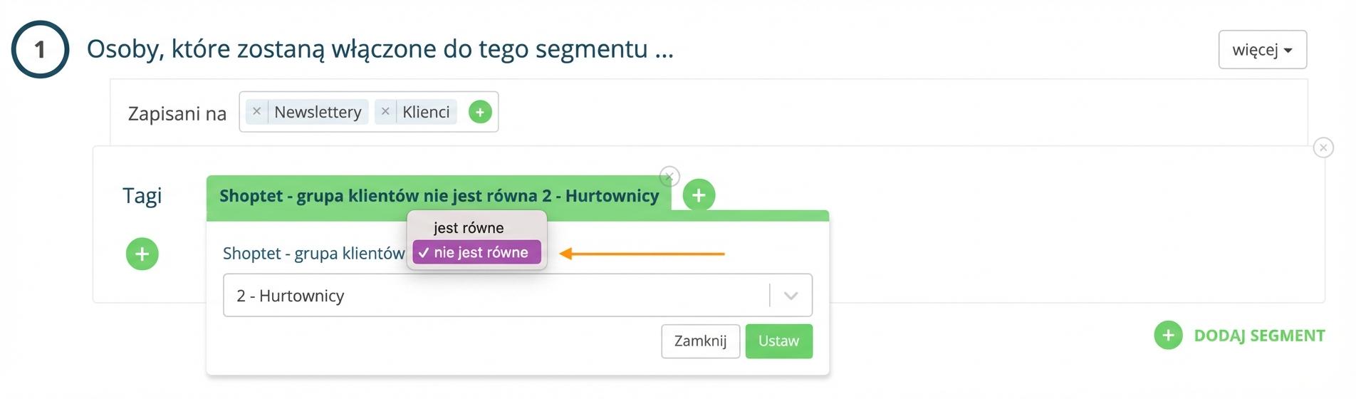 Chcesz na przykład kierować kampanię Porzucony koszyk do wszystkich grup klientów oprócz hurtowników?