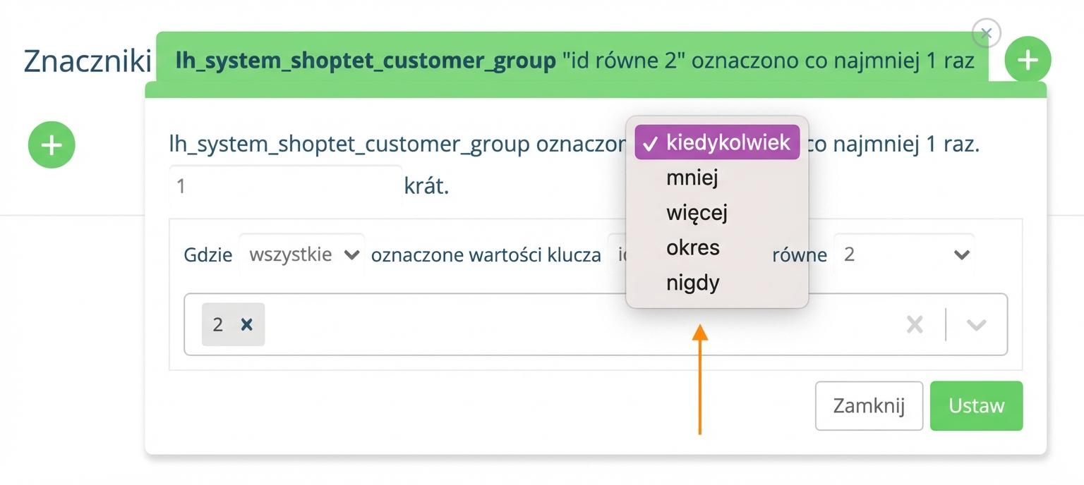Wybór okresu, kiedy została dodana wybrana etykieta według grupy klientów (ewentualnie „nigdy”, gdy wykluczysz grupę z targetowania kampanii)