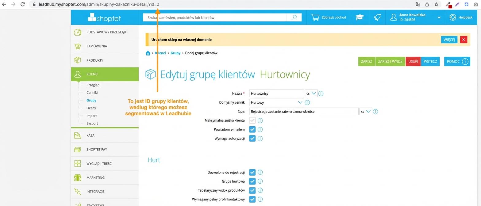 - id - każda grupa klientów ma w Shoptet własne id (uwaga — nie jest to parametr „kolejność” przy grupie)