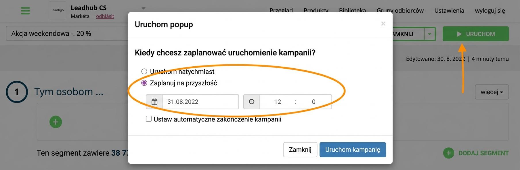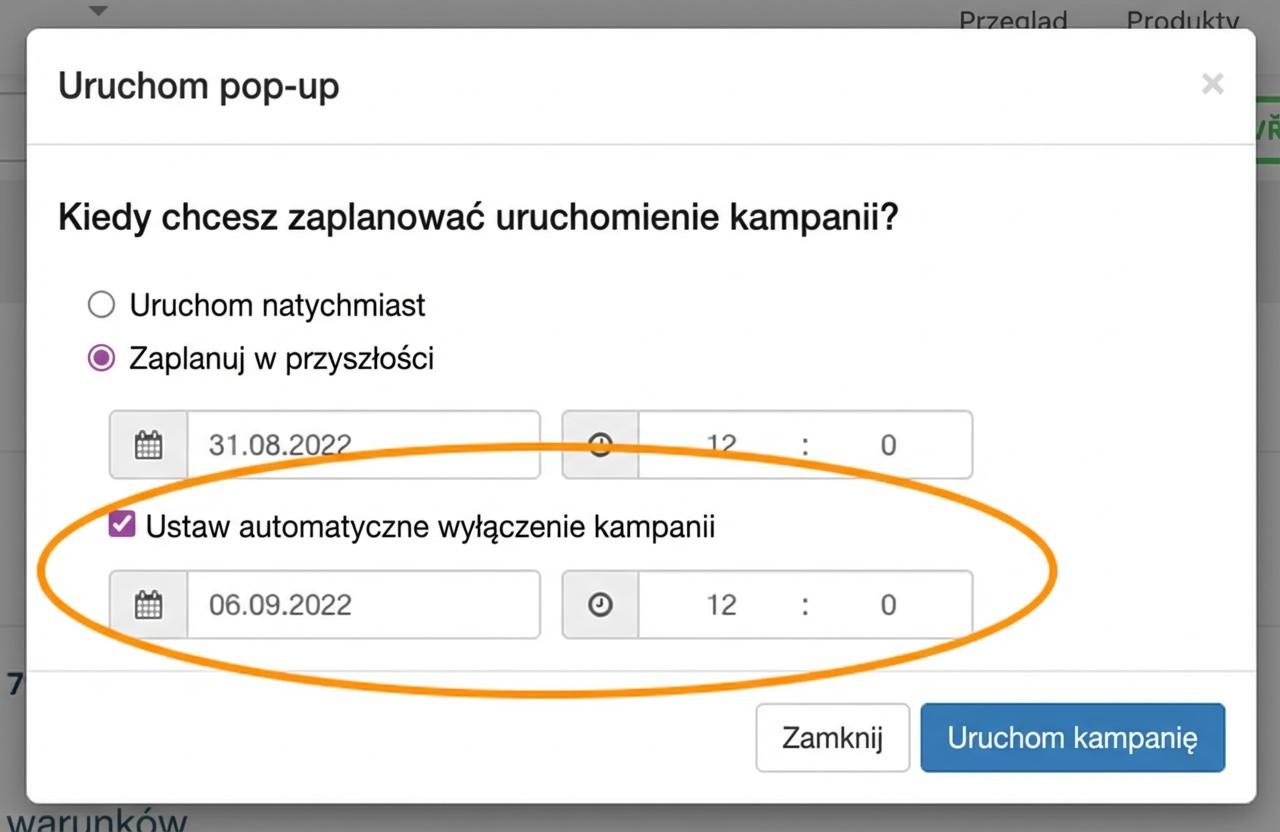 Kampanię pop-up możesz uruchomić od razu lub dowolnie zaplanować jej włączenie i wyłączenie.