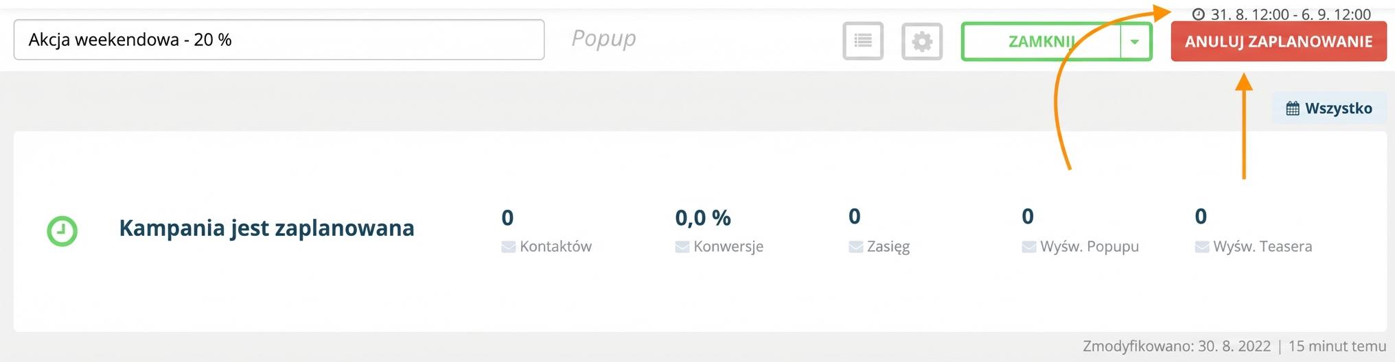 3. Kampania będzie następnie oznaczona w podglądzie „budzikiem”, a po przejściu do jej szczegółów zobaczysz, na kiedy zaplanowano jej automatyczne uruchomienie i wyłączenie. Za pomocą przycisku „anuluj planowanie” zmienisz zdefiniowany czas.
