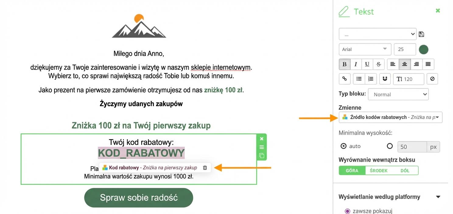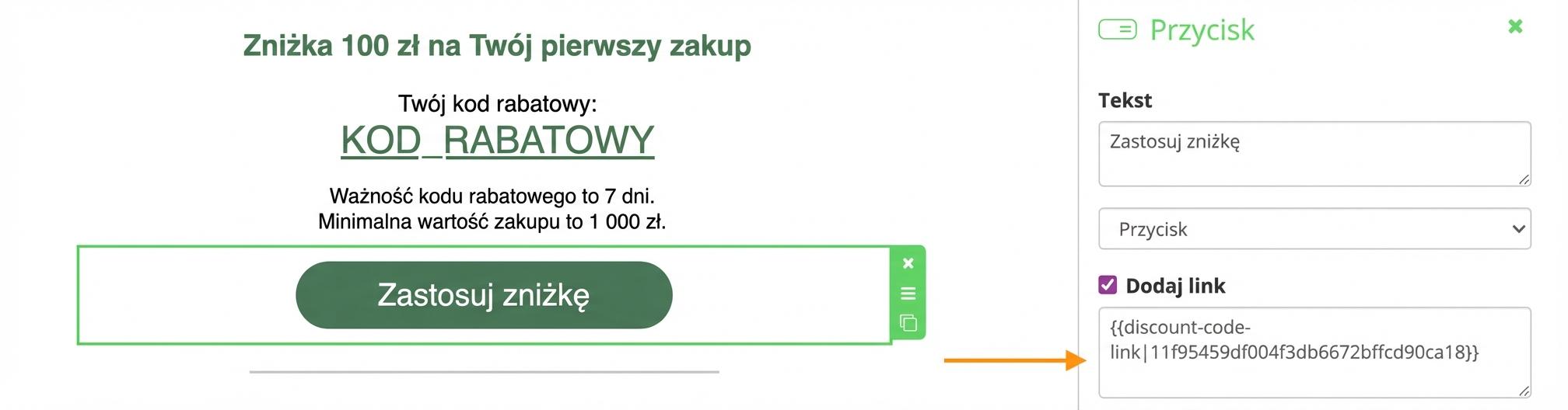 3. Dodaj link do zmiennej Kodu rabatowego. Automatycznie uruchomi się automatyczne dodanie kodu do koszyka.