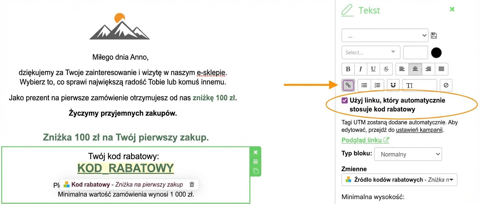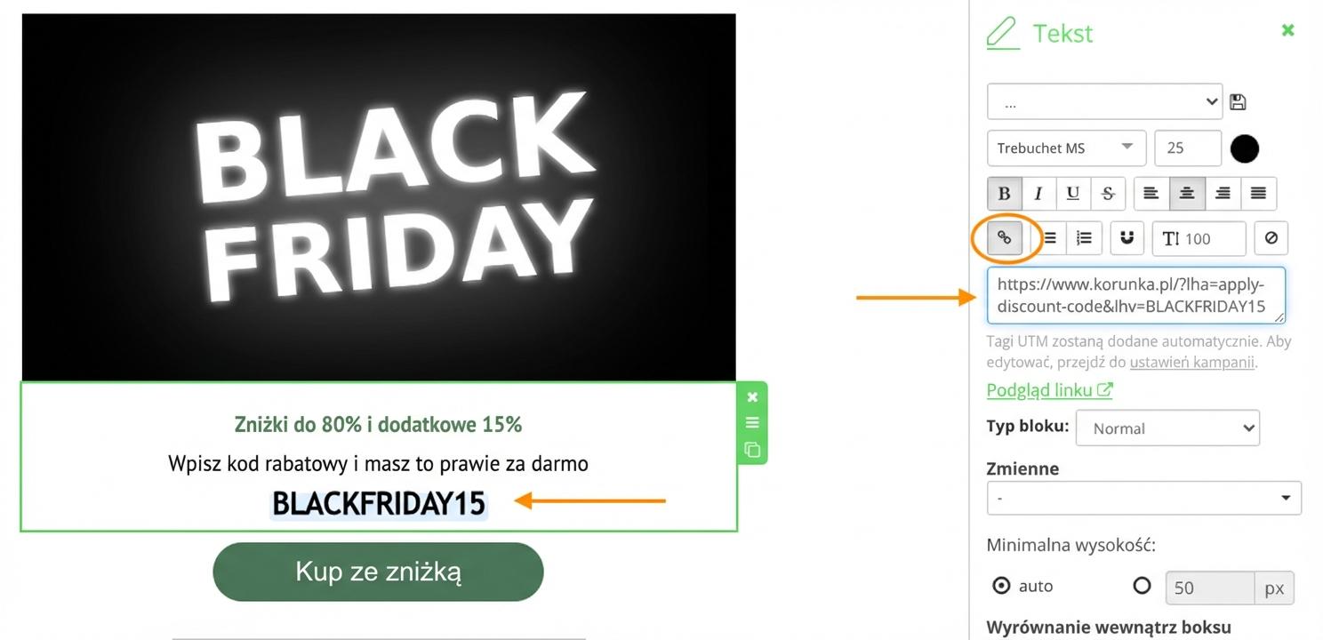 2. Wstaw go do kampanii jako zwykły tekst, do którego dodasz link, aby kod ponownie został automatycznie dodany do koszyka. Do linku należy skopiować następujący zapis: