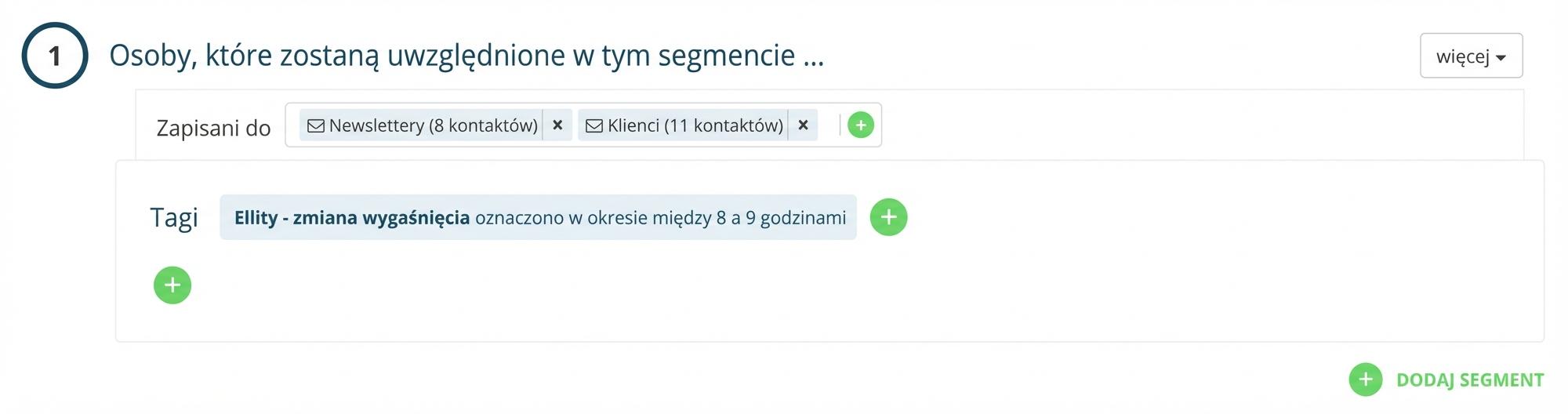 Wyzwalaczem kampanii jest więc utworzenie tagu u konkretnego klienta. Targetowanie automatycznej kampanii będzie następnie wyglądać tak: