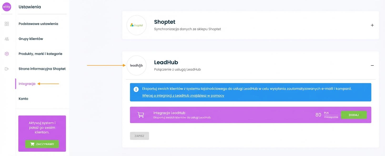 2. Przejdź do ustawień konta i wybierz zakładkę "Integracje". Aktywuj połączenie z Leadhubem, dodając kartę kredytową i opłacając miesięczną opłatę.