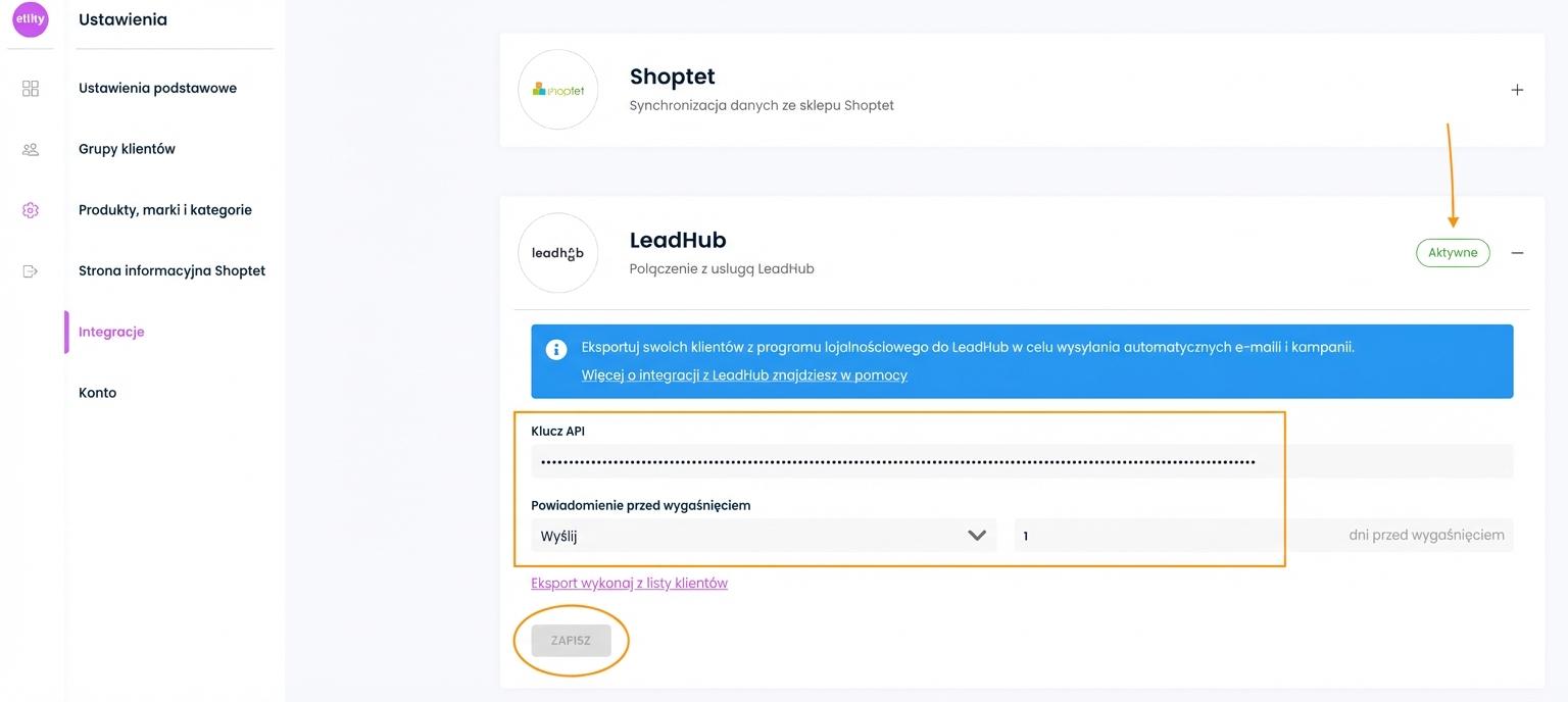 Następnie zarejestruj klucz API w przeznaczonym do tego polu na Twoim koncie w Ellity. Jednocześnie ustaw czas, kiedy do klientów mają trafiać informacje przed wygaśnięciem punktów. Ta wartość zostanie również przeniesiona do Leadhuba i można z niej korzystać w ramach kampanii w Leadhubie. Dzięki temu będziesz w stanie np. 7 dni przed wygaśnięciem punktów wysłać klientowi powiadomienie.