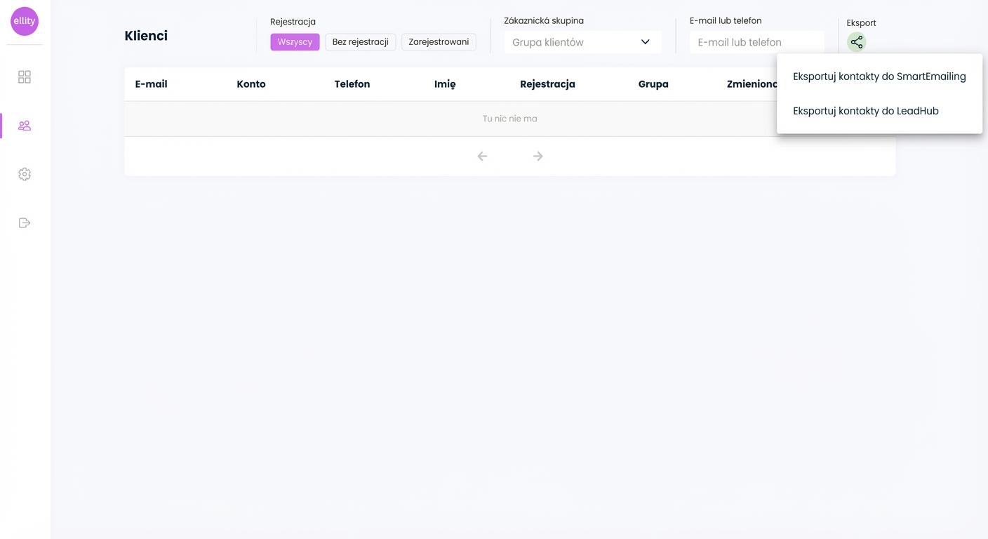 Przejdź w panelu administracyjnym Ellity do Listy klientów i w prawym rogu kliknij przycisk Eksport, a następnie wybierz Eksportuj kontakty do Leadhuba.
