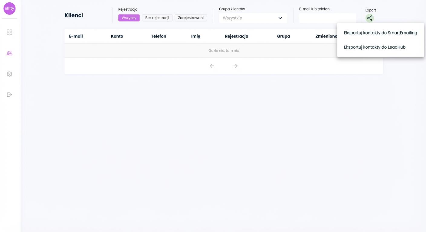 Przejdź w panelu administracyjnym Ellity do Lista klientów i w prawym rogu kliknij przycisk Eksport, a następnie wybierz Eksportuj kontakty do Leadhubu.