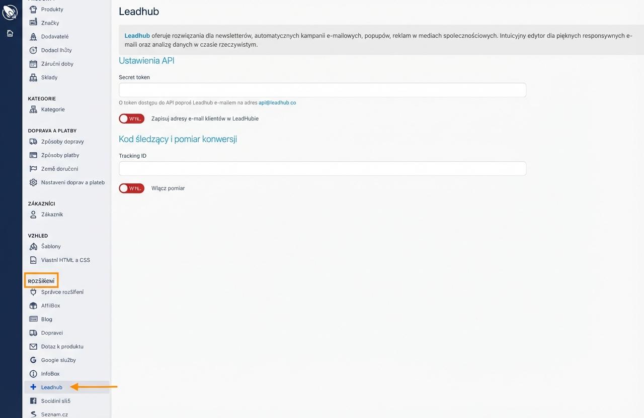 - W panelu administracyjnym Rocketoo przejdź do zakładki „Rozszerzenia → Leadhub”.