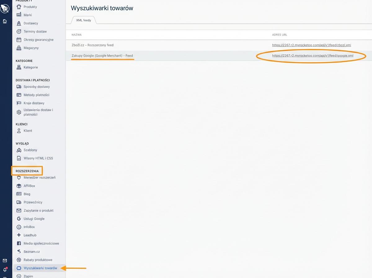 - Adres URL Twojego feedu produktowego (najlepiej Google XML feed) znajdziesz w zakładce „Rozszerzenia → Wyszukiwarki produktów“. Zarejestruj adres URL w Leadhubie.