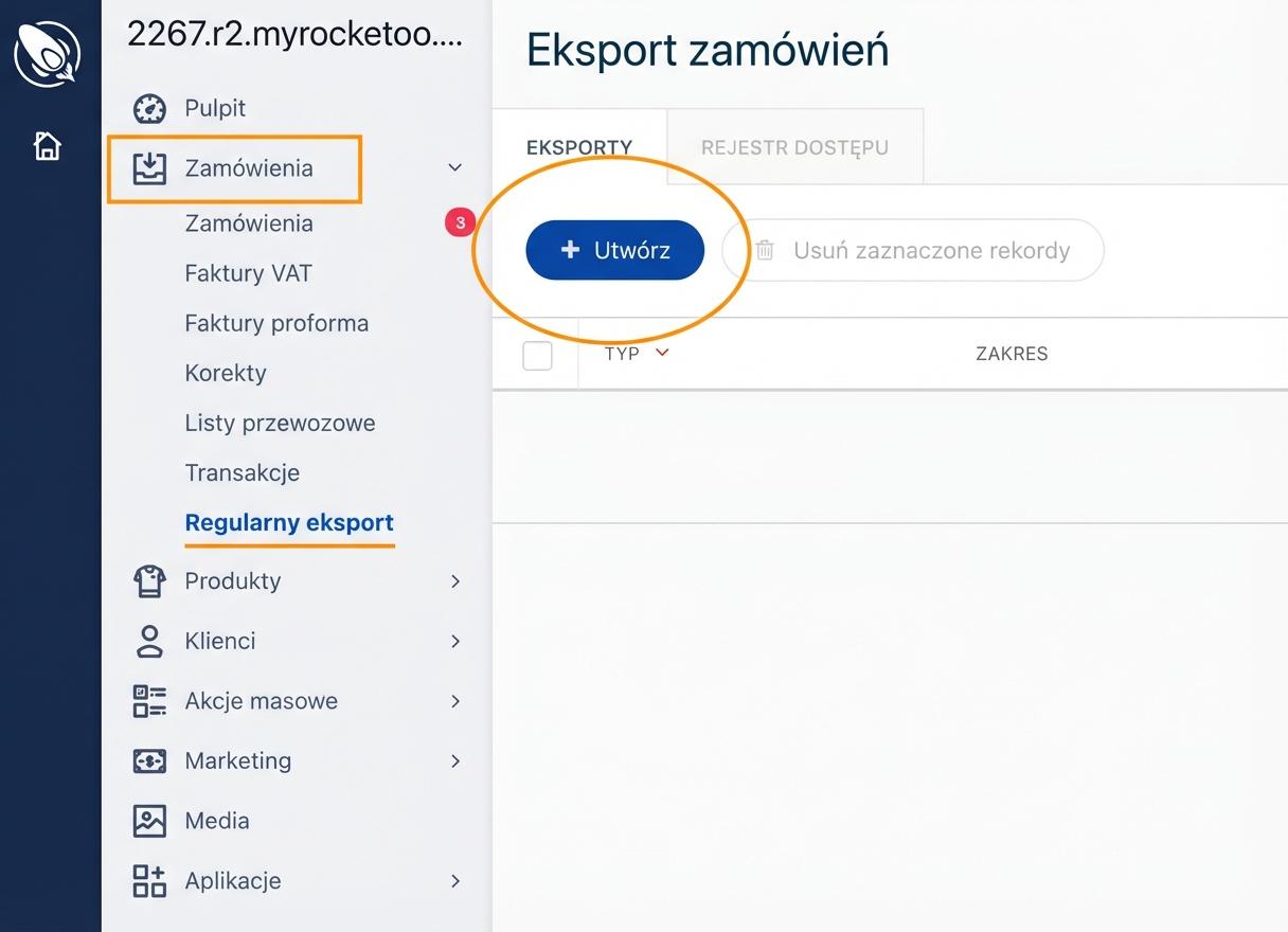 W panelu administracyjnym Twojego e-sklepu przejdź do zakładki Zamówienia → Regularny eksport. Aby utworzyć eksport z historią zamówień, kliknij Utwórz.