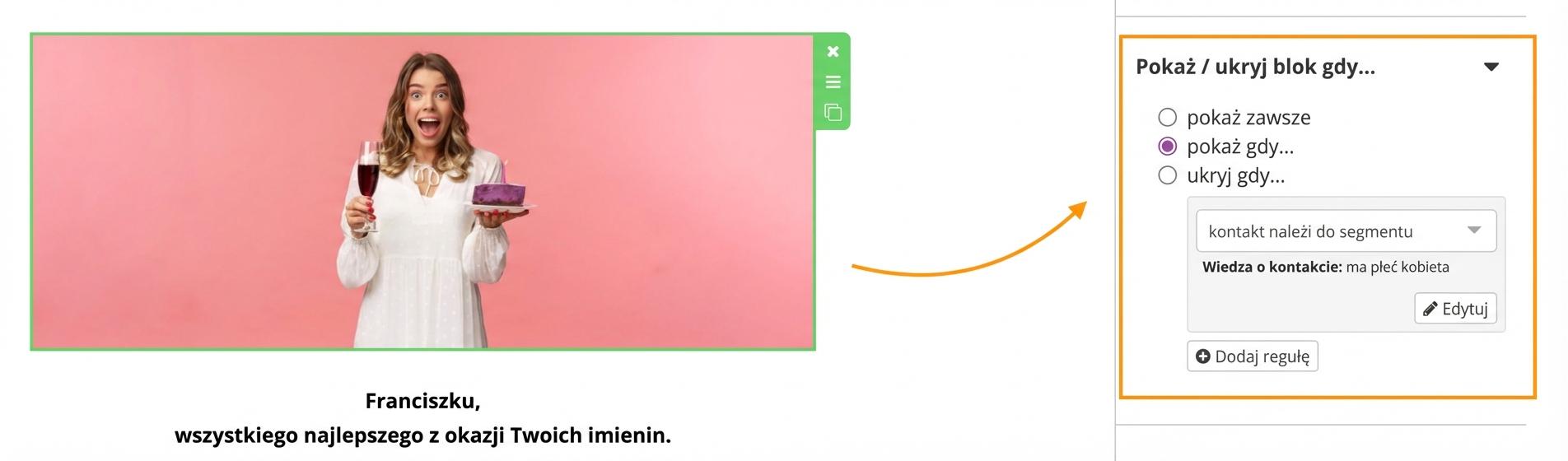 Dla każdego bloku e-maila (tekst, obraz, przycisk, ..) ustawisz warunki, dla którego segmentu Twoich subskrybentów i klientów dany blok ma się wyświetlić lub przeciwnie – nie ma się wyświetlić. Jest to tzw. spersonalizowane (warunkowe) wyświetlanie bloków na podstawie przynależności do zdefiniowanego segmentu.