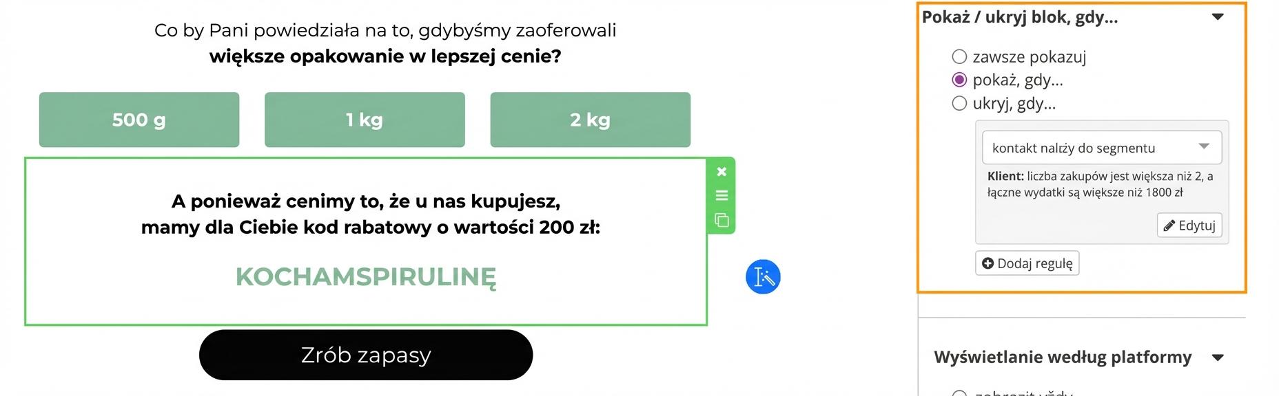 Przed uruchomieniem kampanii zawsze sprawdź, czy reguły ukrywania lub wyświetlania dla poszczególnych bloków są ustawione poprawnie. Dzięki temu zweryfikujesz, komu i które bloki będą się wyświetlać.