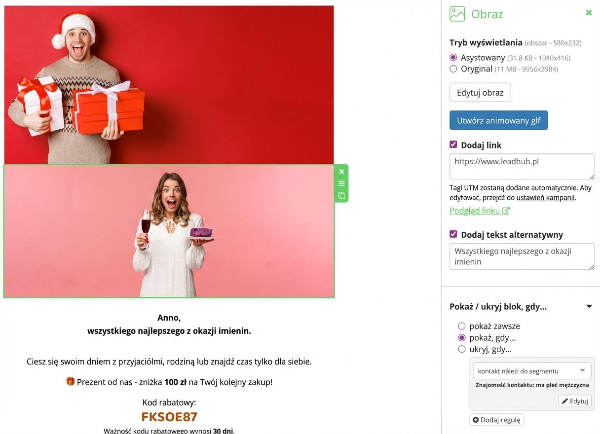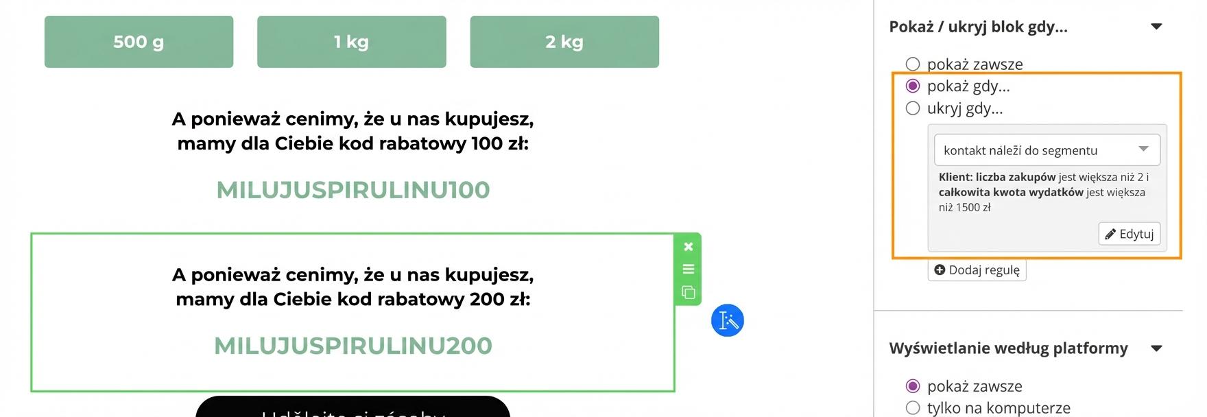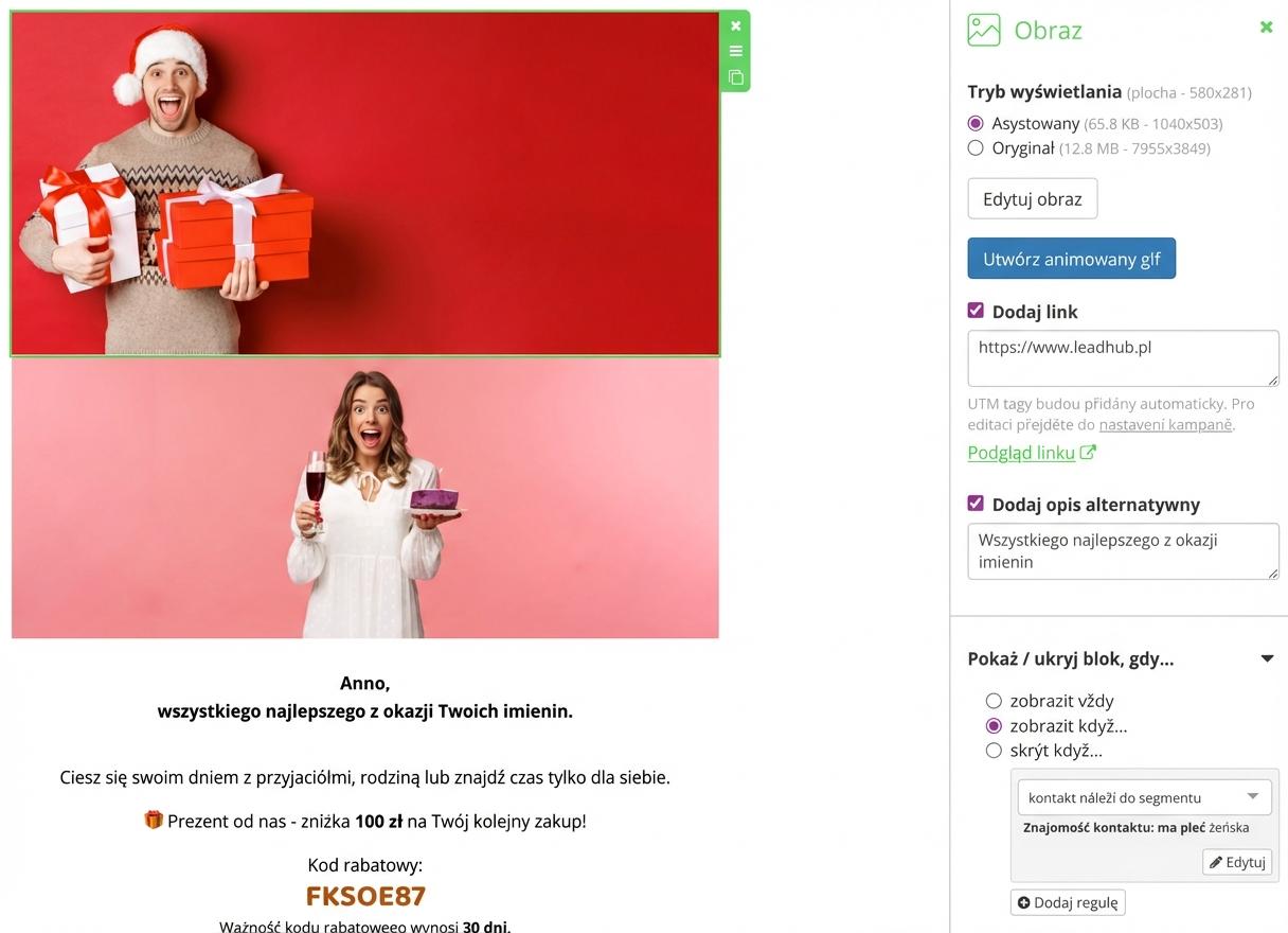 Kliknij obiekt, dla którego chcesz ustawić spersonalizowane wyświetlanie. Następnie w prawej części edytora ustaw warunki, przy których go wyświetlisz lub przeciwnie – ukryjesz. Grupę subskrybentów zdefiniuj, wybierając odpowiednie reguły segmentacji.