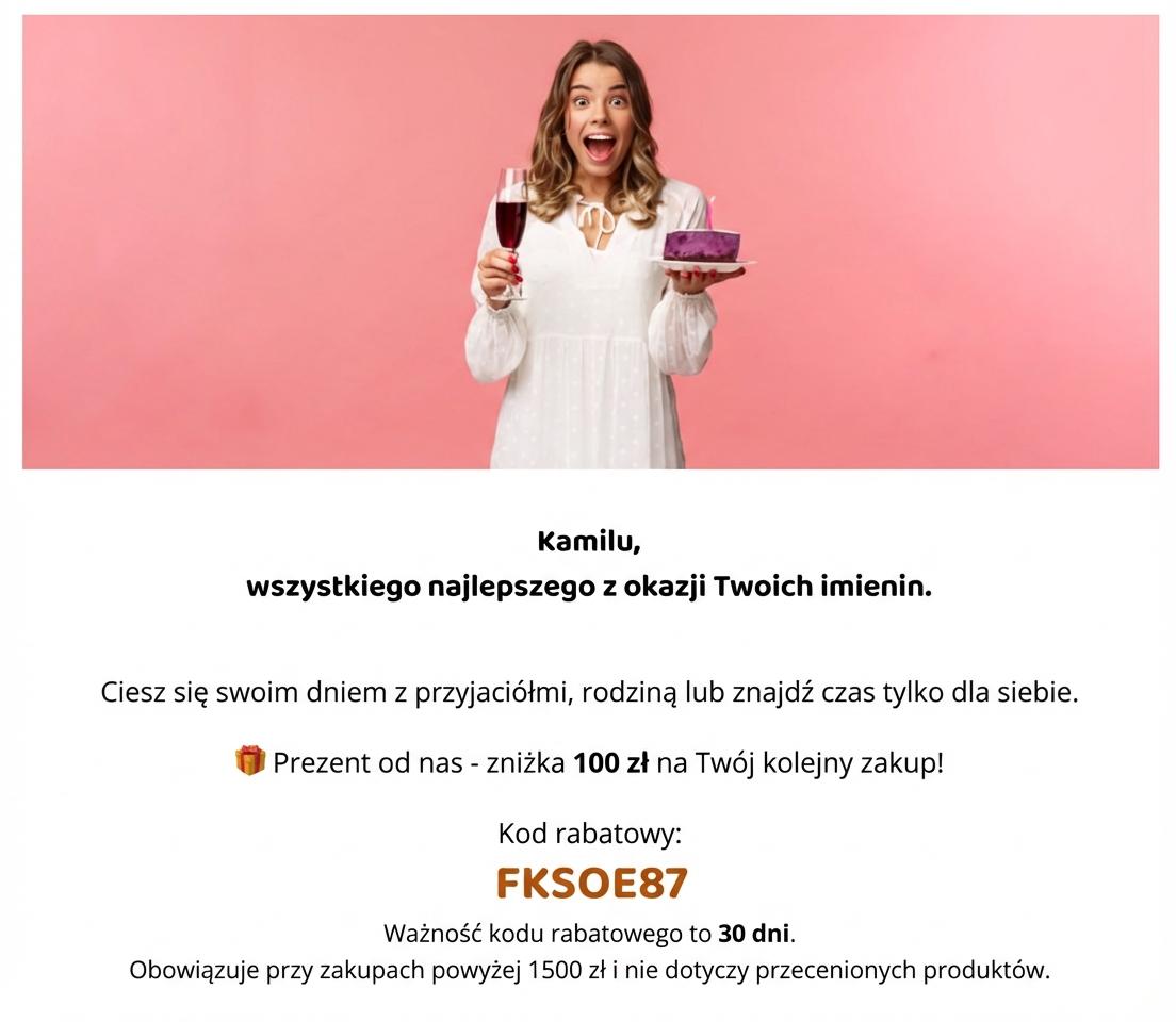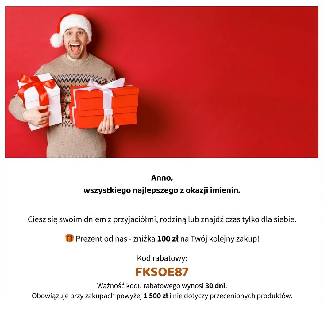 - Kod rabatowy 100 zł, który zostanie wyświetlony klientom, którzy dokonali więcej niż 2 zakupy i wydali w przedziale 800 - 1500 zł