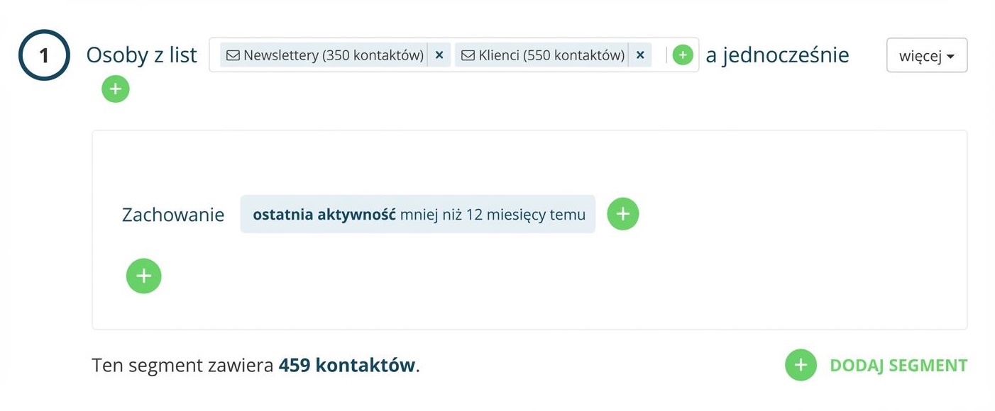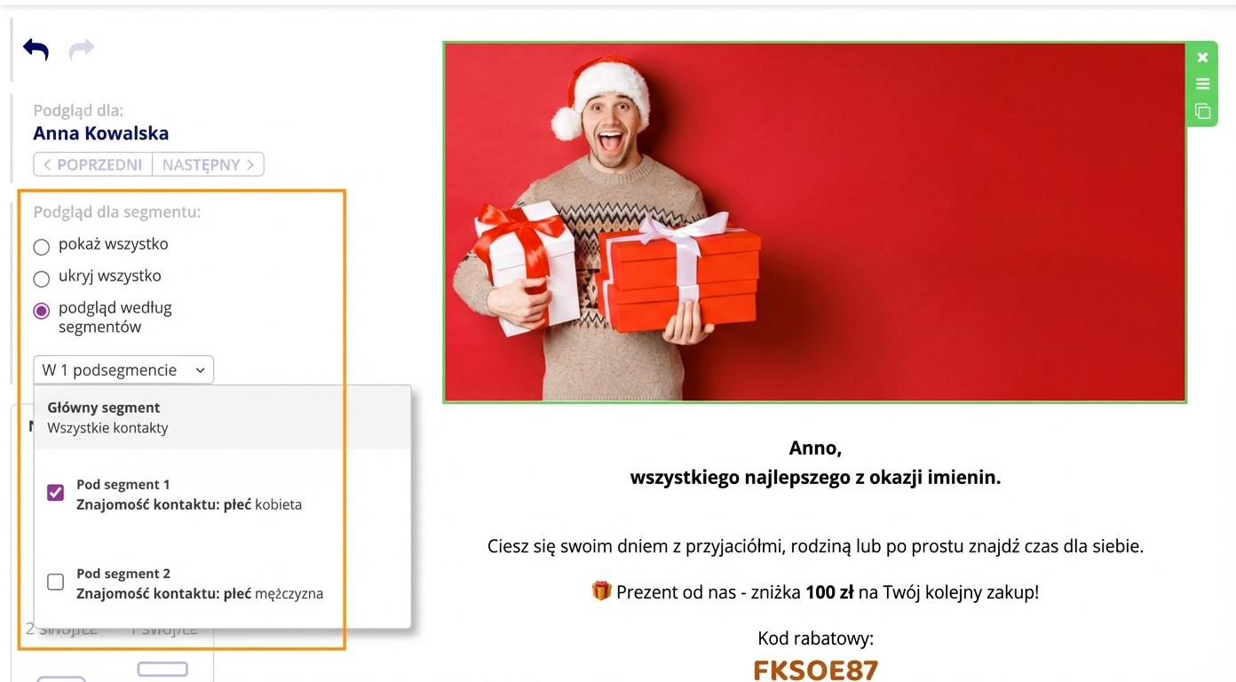 - podgląd według segmentów - wybierzesz jeden ze zdefiniowanych segmentów i w e-mailu wyświetlą się bloki tylko dla wybranego segmentu