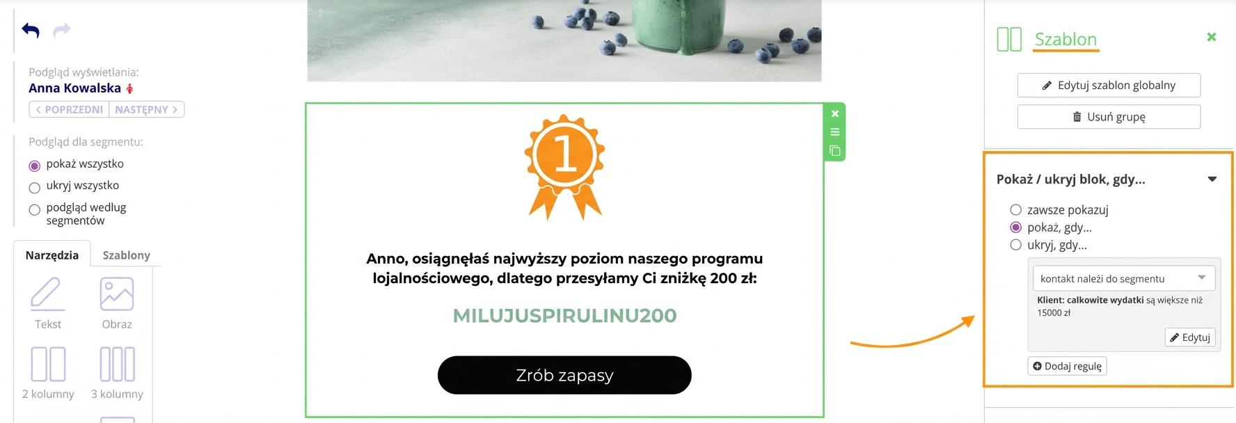 Ten szablon wyświetli się tylko odbiorcom, którzy spełnią warunek, że ich suma wydatków jest wyższa