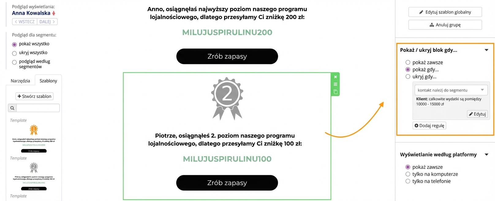Tak samo skonfigurowałoby się szablon, który ma wyświetlać się tylko klientom, którzy wydali w przedziale