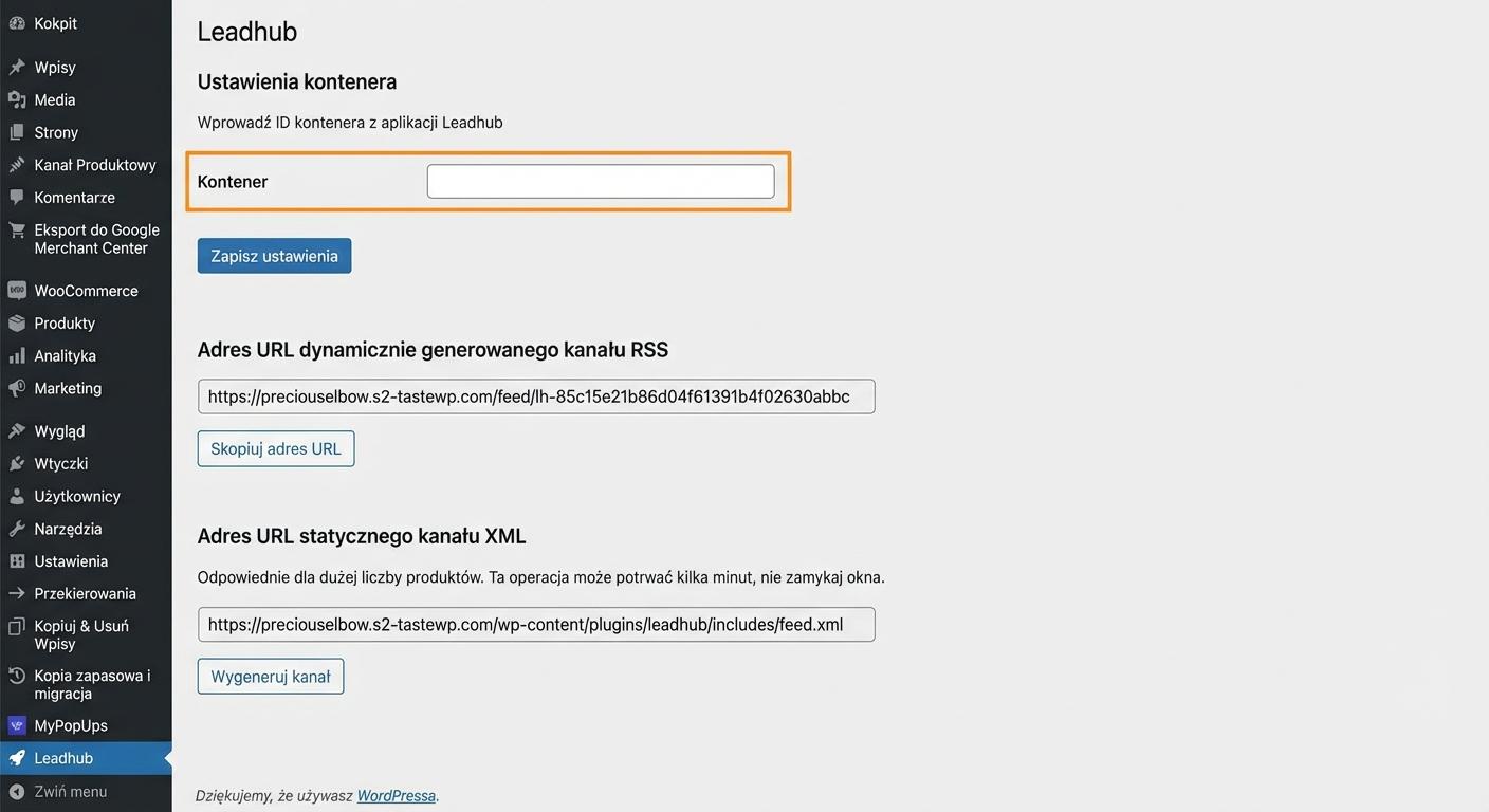 W polu „Kontener” wpisz Tracking ID, które znajdziesz we wstępnej konfiguracji w Leadhubie. Zapisz ustawienia.