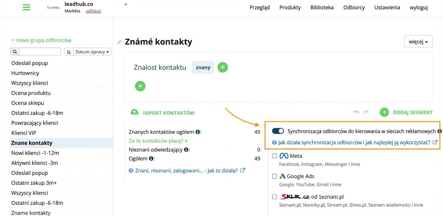 Połączysz swoje konto w Leadhubie z systemem reklamowym Google Ads, a następnie łatwo zsynchronizujesz z nim dowolną Grupę odbiorców reklam (segment) kontaktów. Dzięki temu Twoja reklama w Google będzie precyzyjniej kierowana do odpowiednich odbiorców, którzy są aktualizowani w czasie rzeczywistym.
