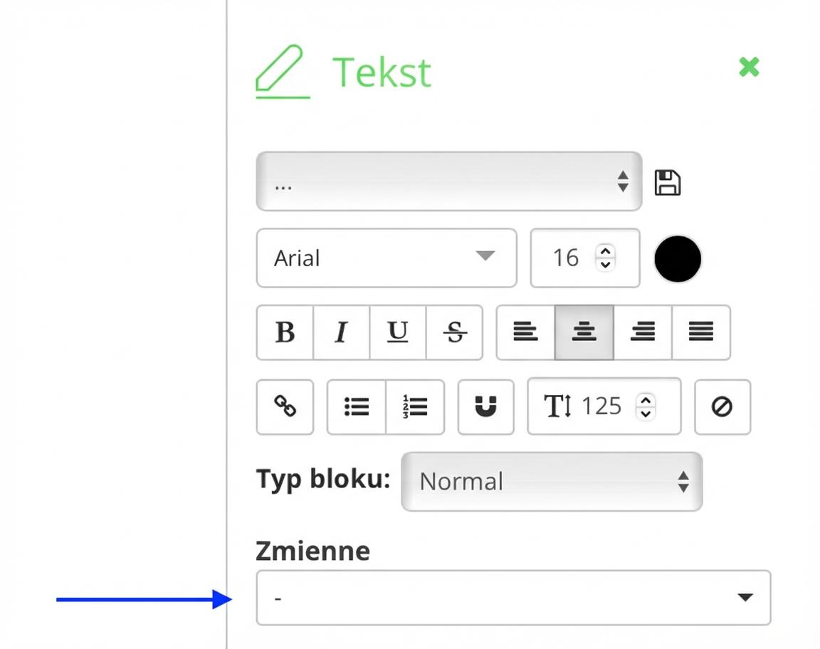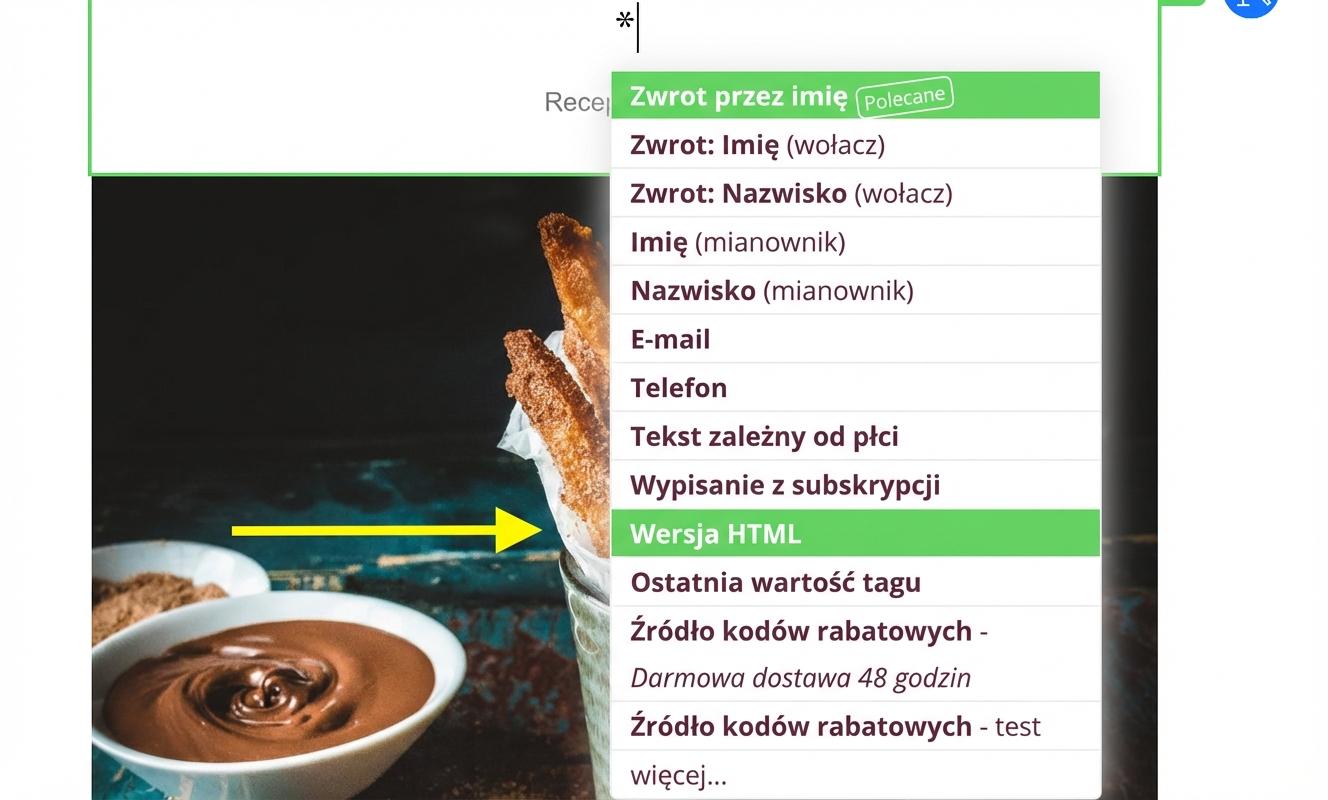 Link do wersji webowej możesz wstawić do e-maila w taki sposób, że w tekście wpiszesz znak gwiazdki —> * albo w widżecie tekstowym wybierzesz z menu zmiennych:
