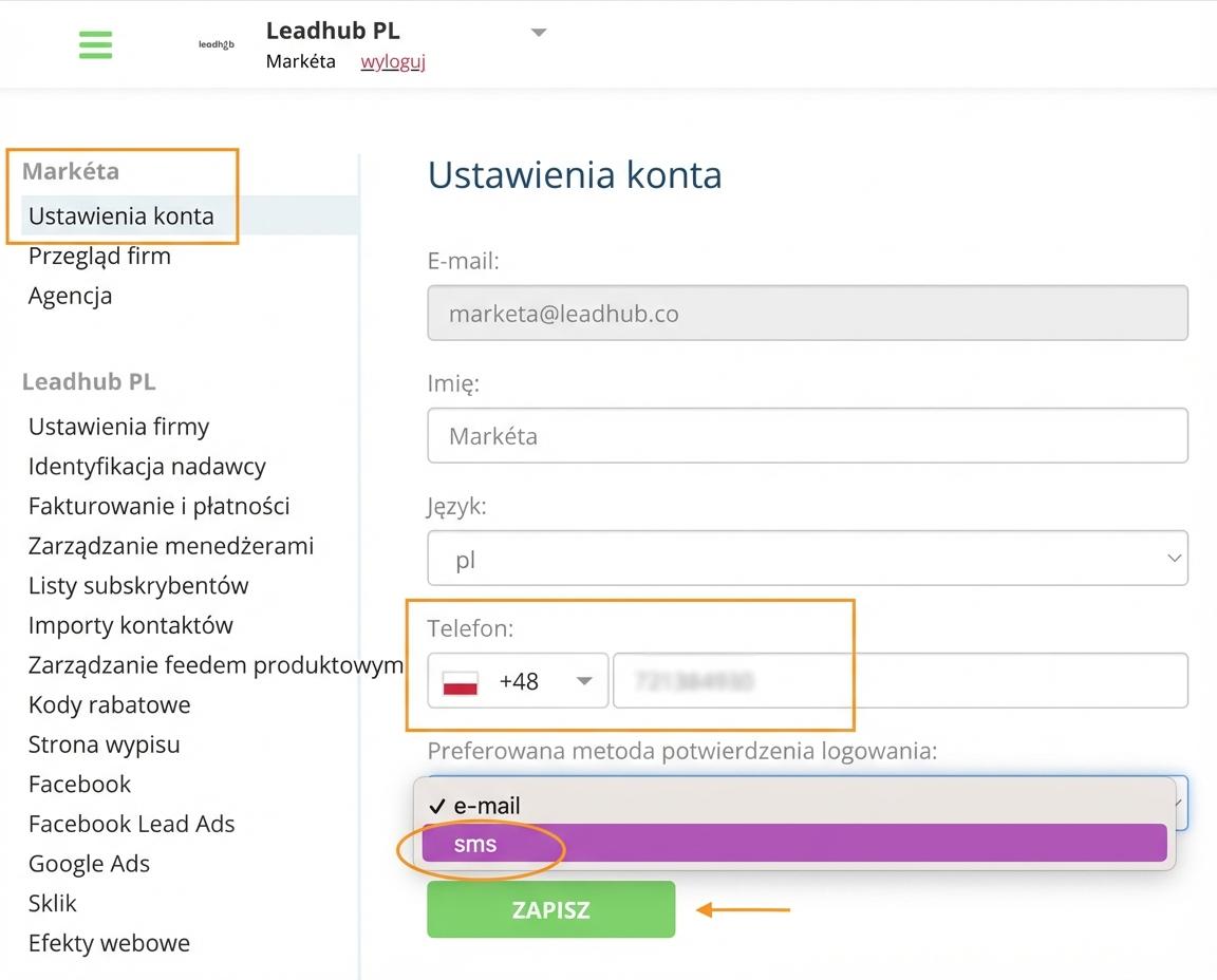 Kod do uwierzytelniania dwuskładnikowego domyślnie wysyłamy e-mailem. Możesz jednak zmienić metodę na SMS, co ustawisz w kilka chwil w swoim profilu w Leadhubie.