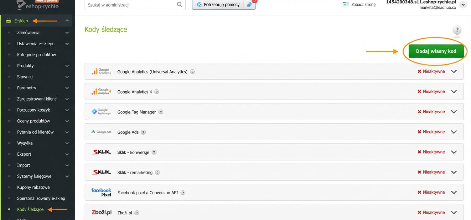 - W panelu administracyjnym swojego e-sklepu przejdź do zakładki „E-shop → Kody pomiarowe“. W prawym rogu wybierz opcję „Dodaj własny kod“.