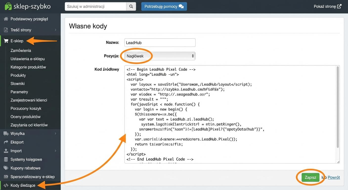 Wstawienie skryptu, krok nr 2a W polu nazwa wpisz np. Leadhub. Jako pozycję wybierz Nagłówek. Do pola na kod źródłowy wklej nasz skrypt i zapisz.