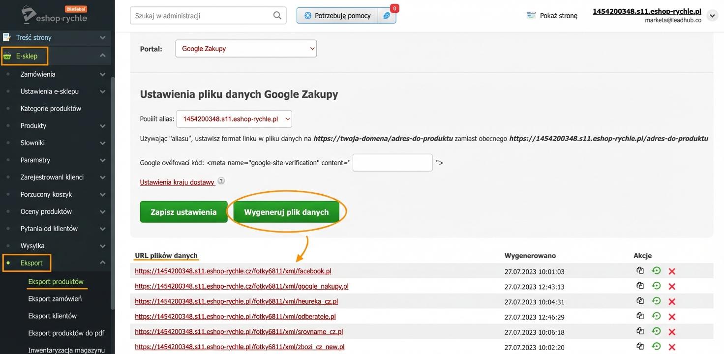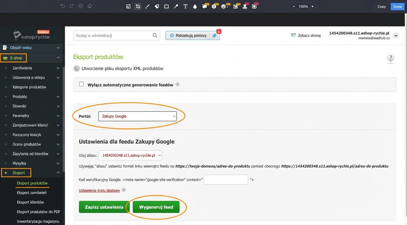 - wyeksportować feed produktowy i zarejestrować go w Leadhubie